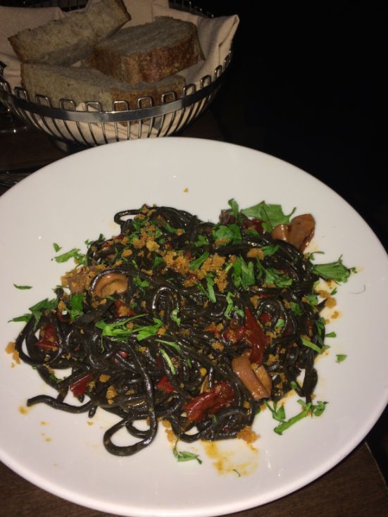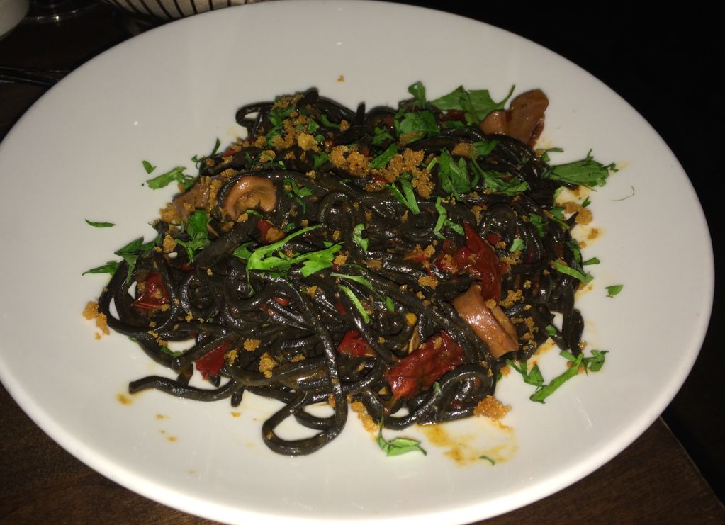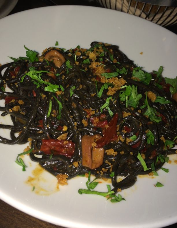 Squid ink Tonnarelli -Calamari, senise peppers, fried breadcrumbs, lemon - $24