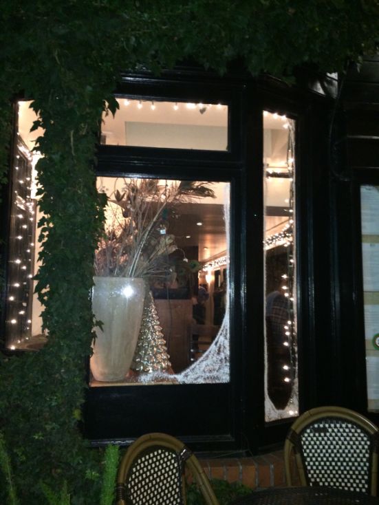 The storefront is narrow and it is certainly decorated for the holiday.