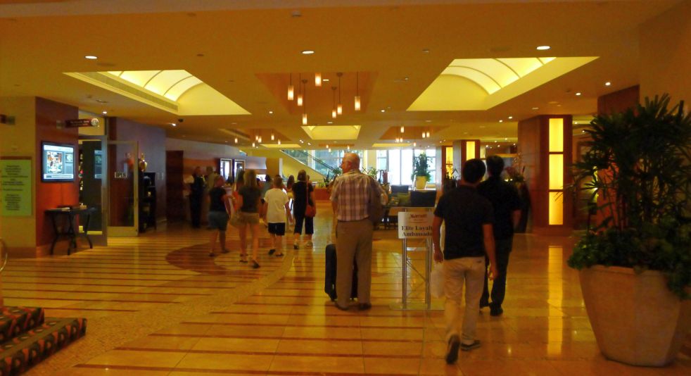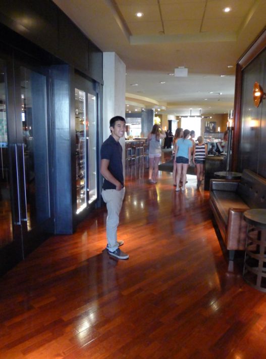 Kevin and Hoa (on the left of the picture) walking in the lobby of the hotel in order to get to the restaurant.