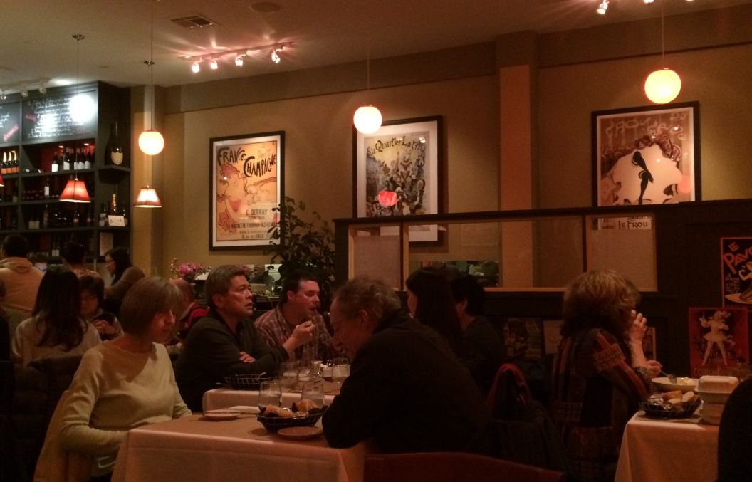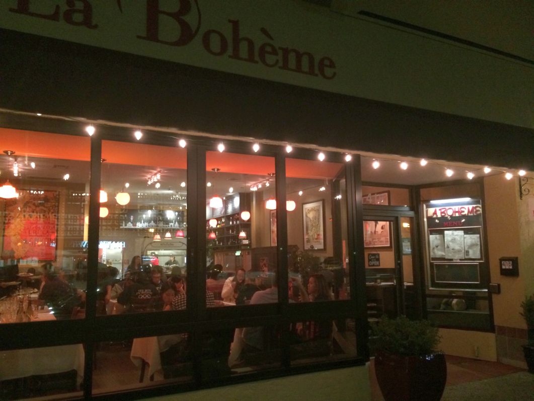 The interior of La Bohème is really cozy, tables are set to be very close, with booth seating and a bar at the end of the room.