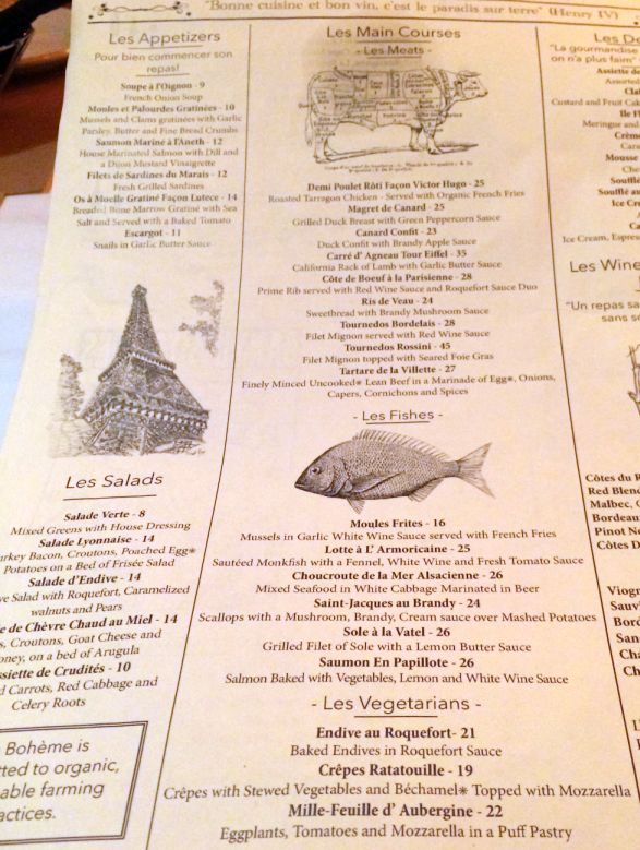 All of the 5 appetizers we ordered I only like the Mussels and Claims gratinées with garlic and the Bone Marrow. The escargots did not meet my expectation, the grilled sardines were just okay. Most of the main dishes are okay with the exception of the Monfish which was really a horrible dish that should be removed from their menu.