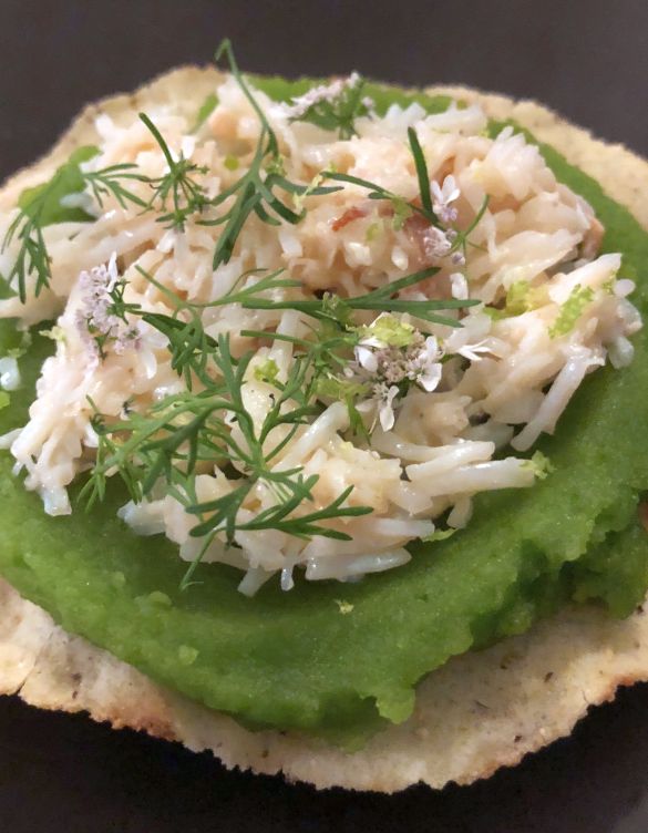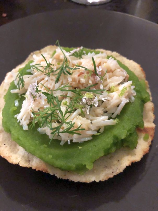 4-Homemade crackers, puree of fresh peas, crab meat