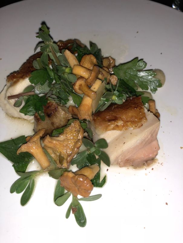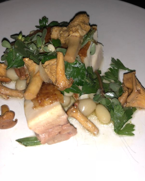 The main dish is a braised pork belly with mushrooms, beans, parsley, etc...