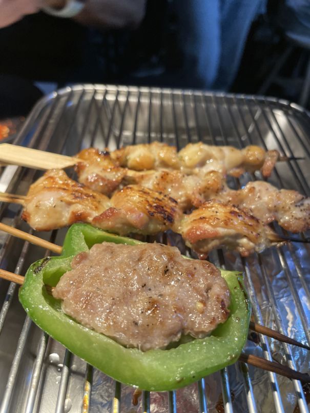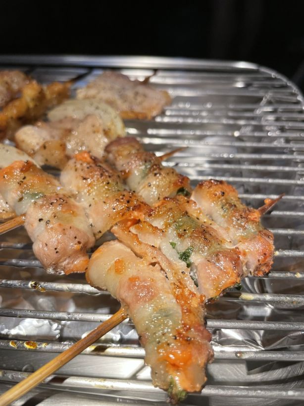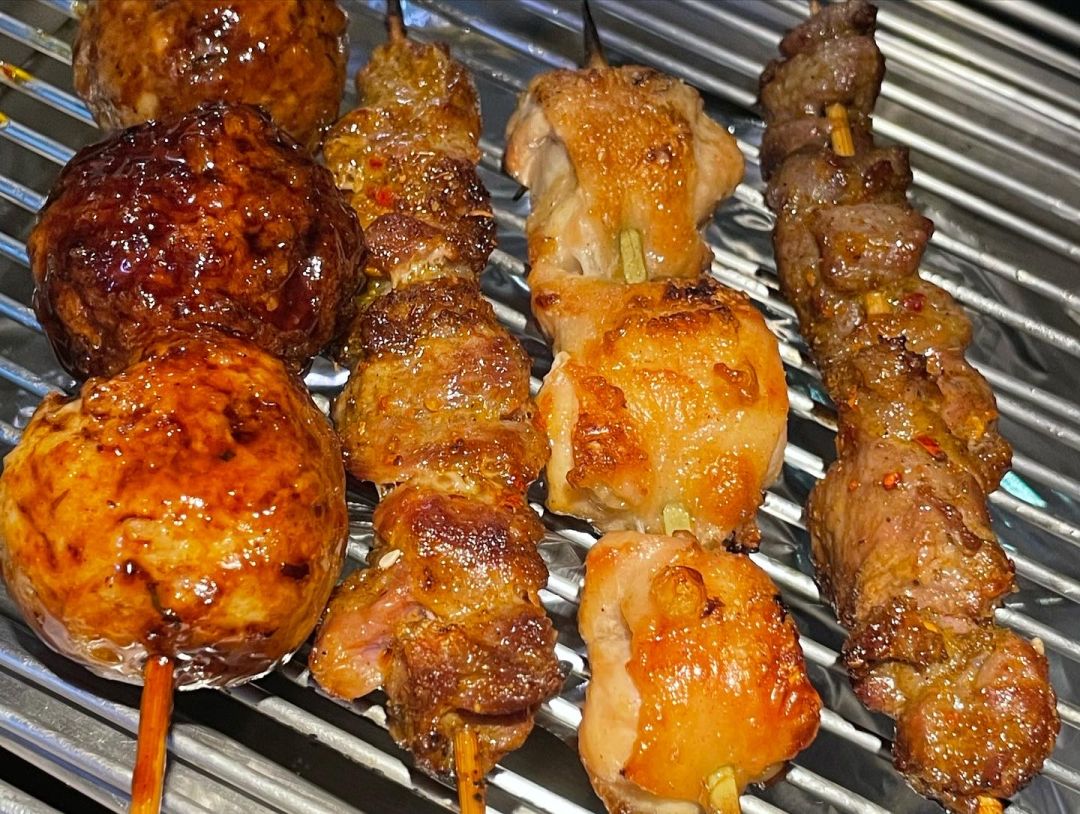 Chicken wings, chicken thigh, chicken heart, Ginko nuts, and teriyaki chicken.