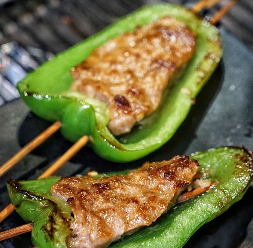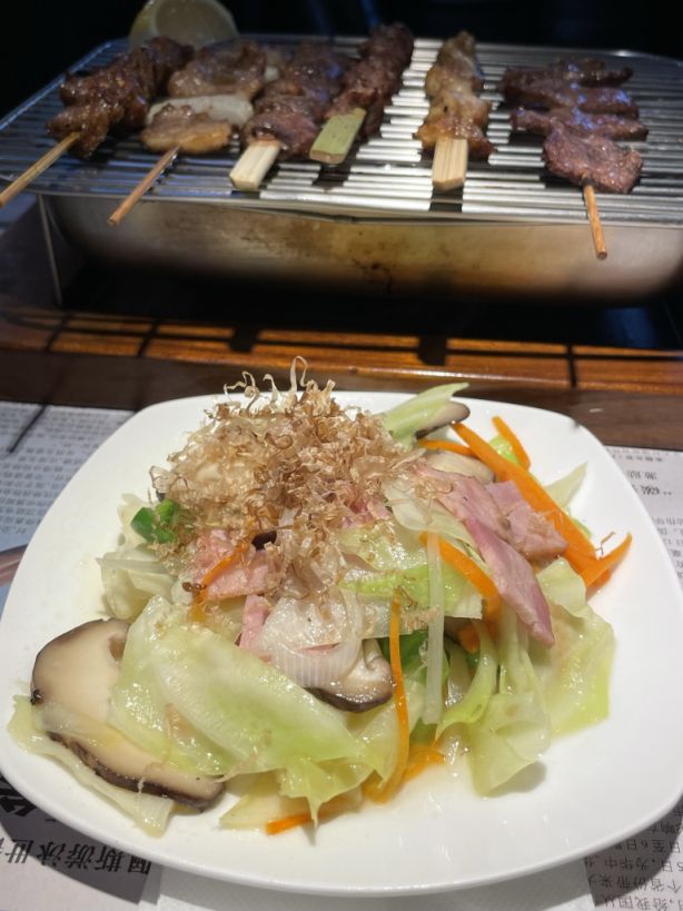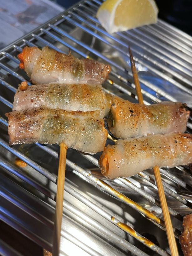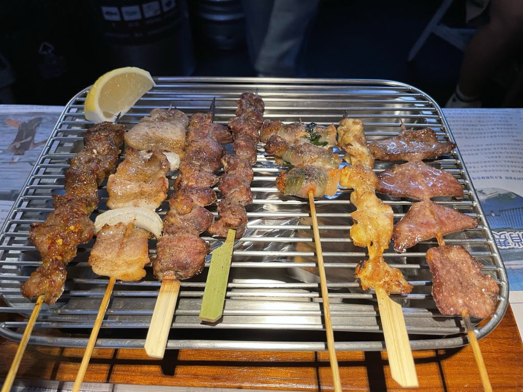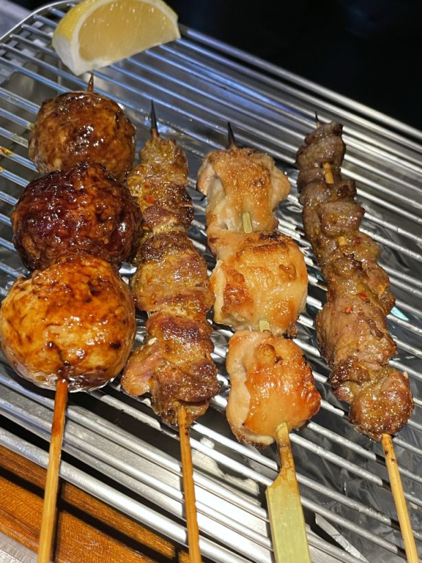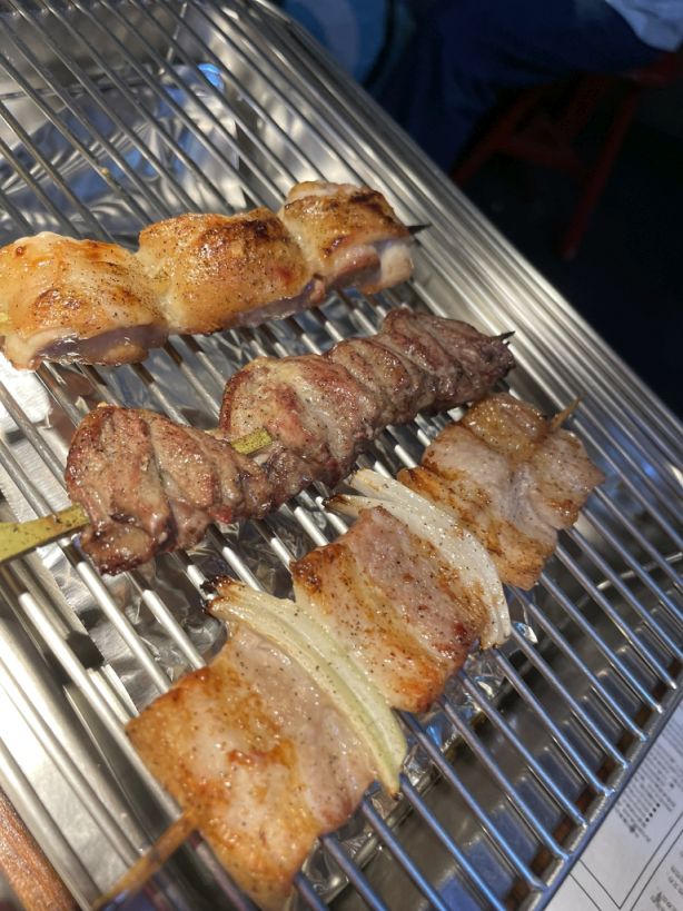 Lamb skewer, pork belly, heart, bacon with shiso, chicken ass, and beef tounge.
