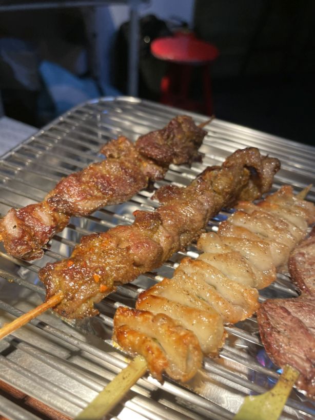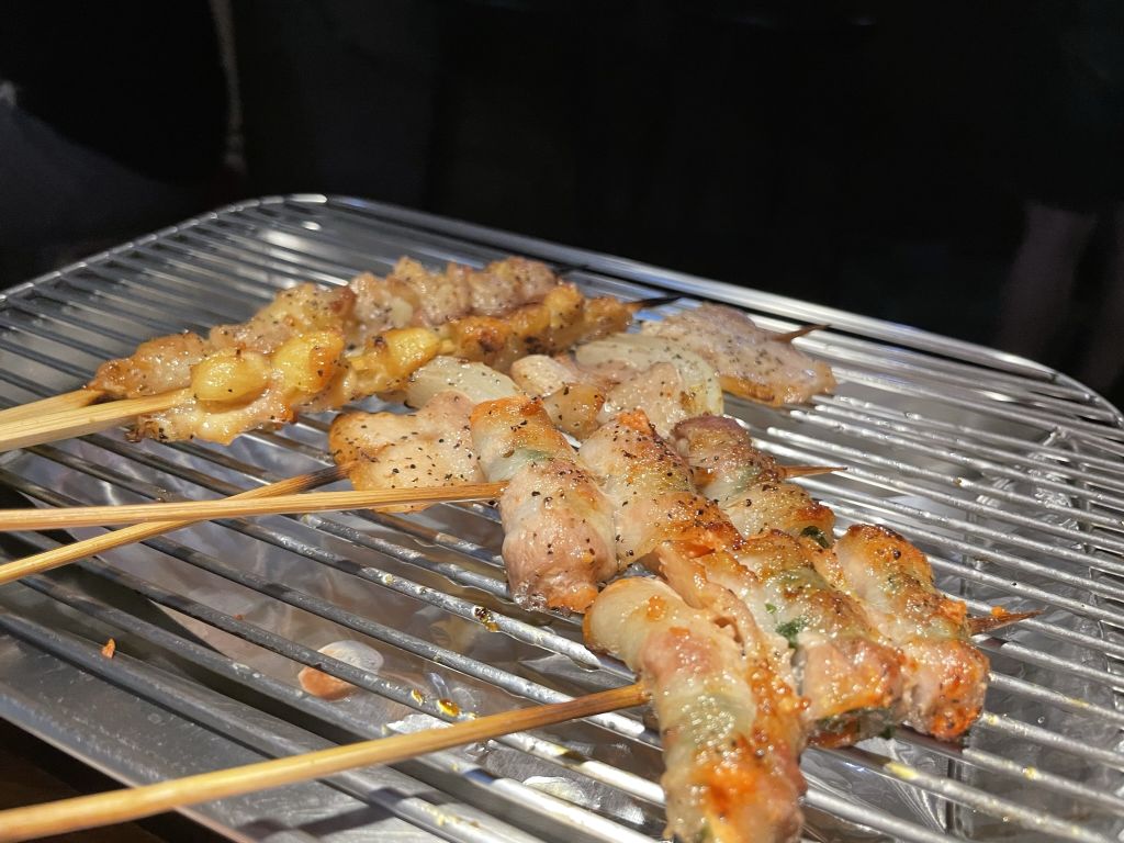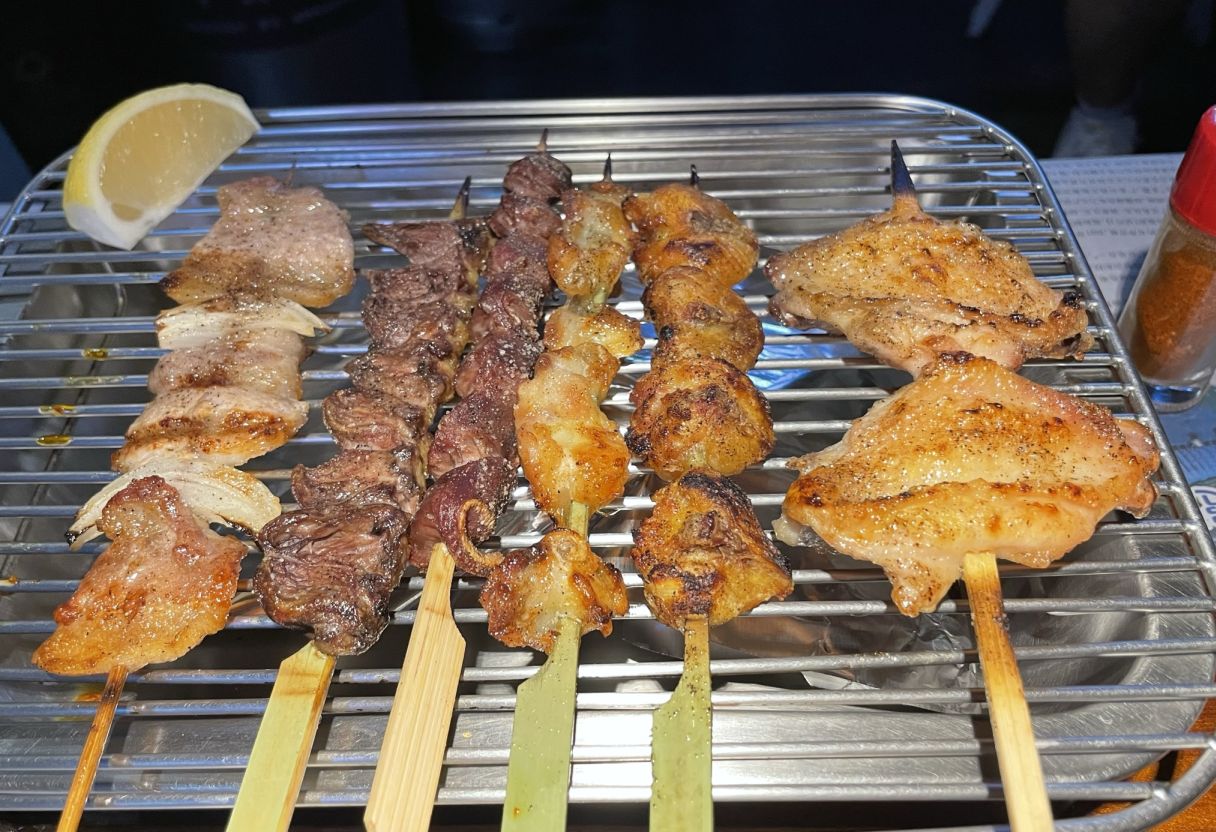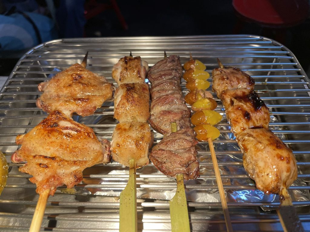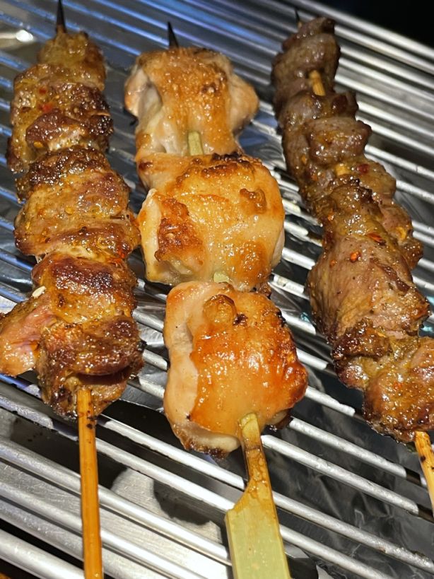 Chicken meatballs, Lamb skewer, Chicken thigh, and another lamb skewer.