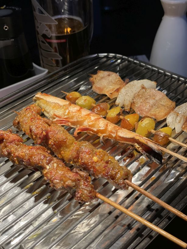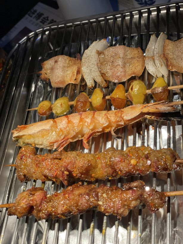 Lamb skewers, grilled shrimp, ginko nuts and pokr belly.