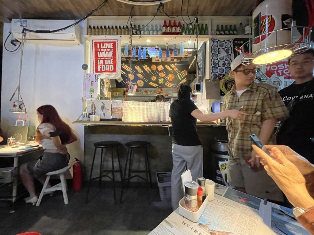 Store front with people sitting outside on low table. Seems like it is really fun way to eat...