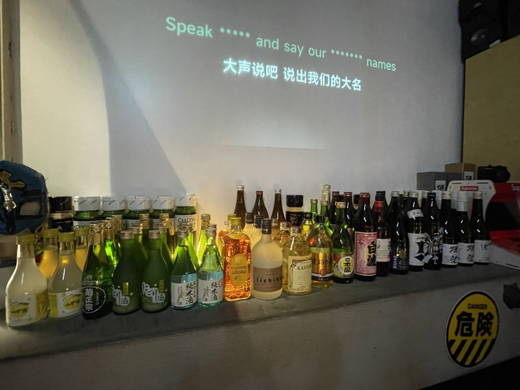 The far wall is projected with Karaoke songs and below on the counter a row of alcoholic beverage.