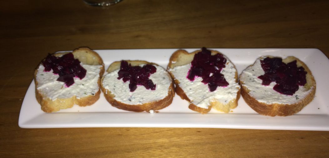 Compliment of the chef: toasted bread with gorgonzola cheese topped with roasted beet.