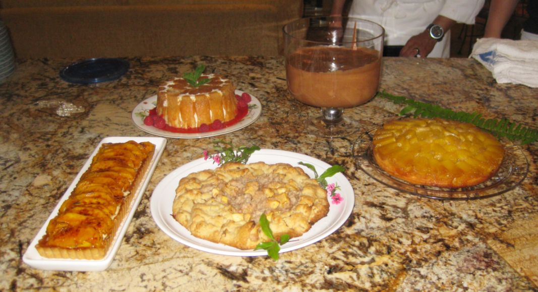 Mango tart, Apple crumb, upside down pineapple, Charlotte, and mousse au chocolat.