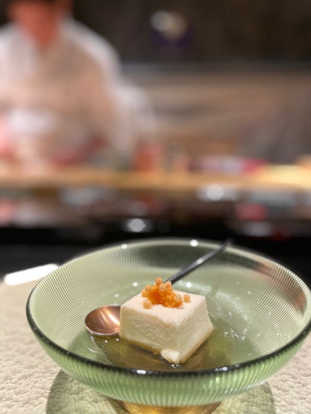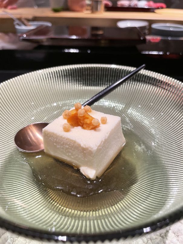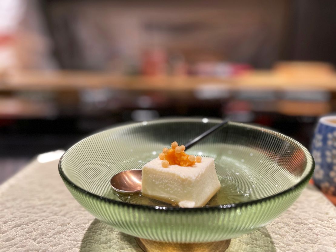 The 3rd course is a creamy tofu served sweet syrup and topped with crunchy puffy rice.