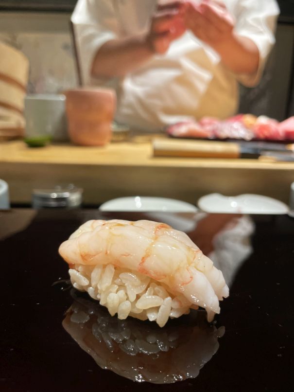 Sweet ebi on the left and on the right is red snapper with pan seared scallop on top.