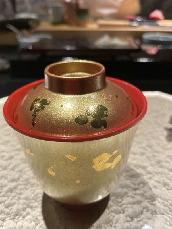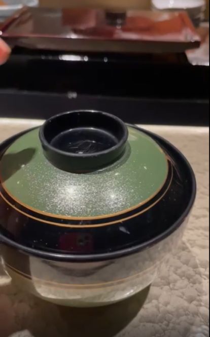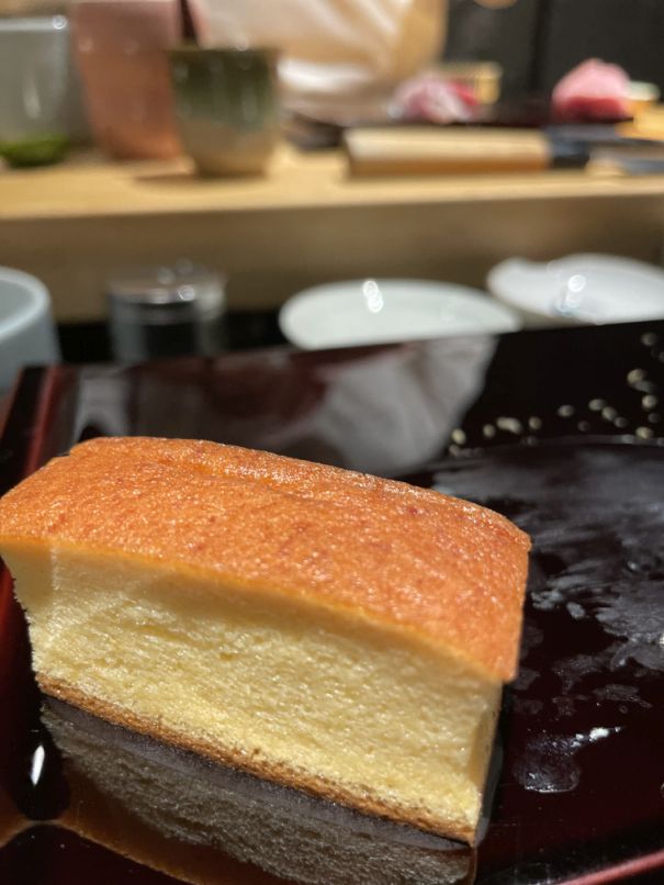 Ending the meal with a simple soup on the left and on the right is a Japanese Castella cake