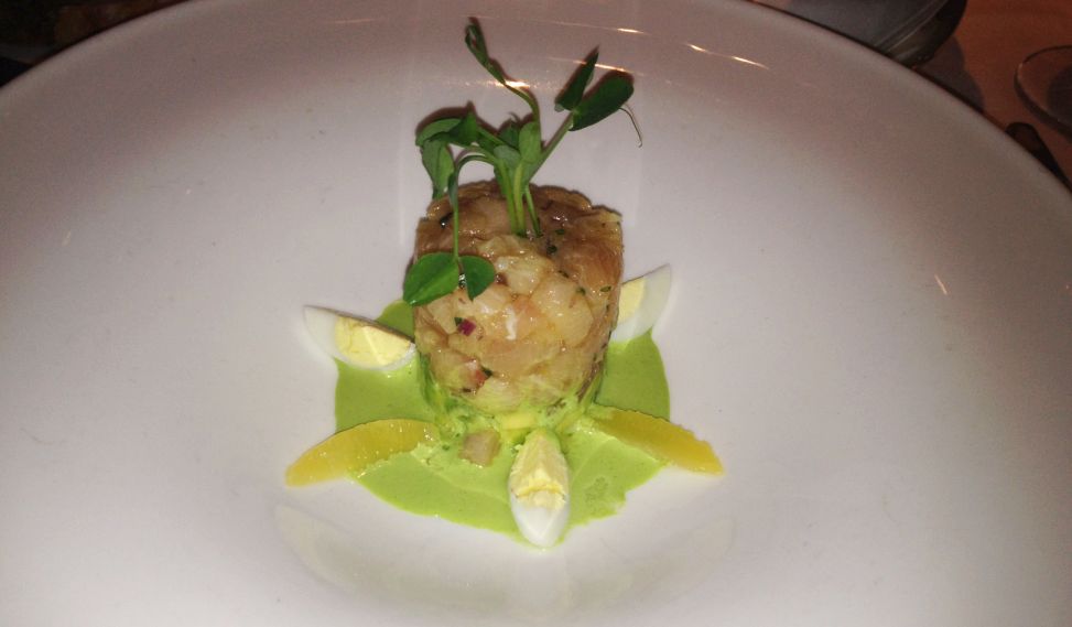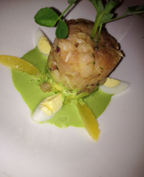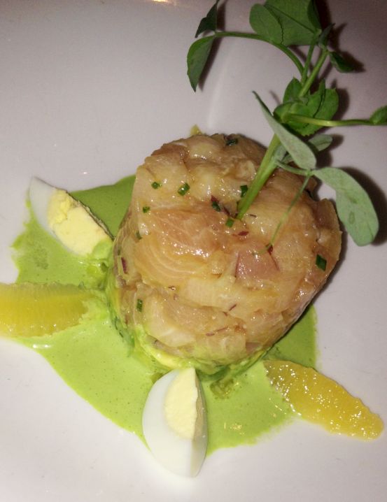 I selected the Truffle Hamachi tartare with Avocado, lemon, Pea shoot emulsion.