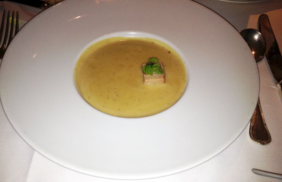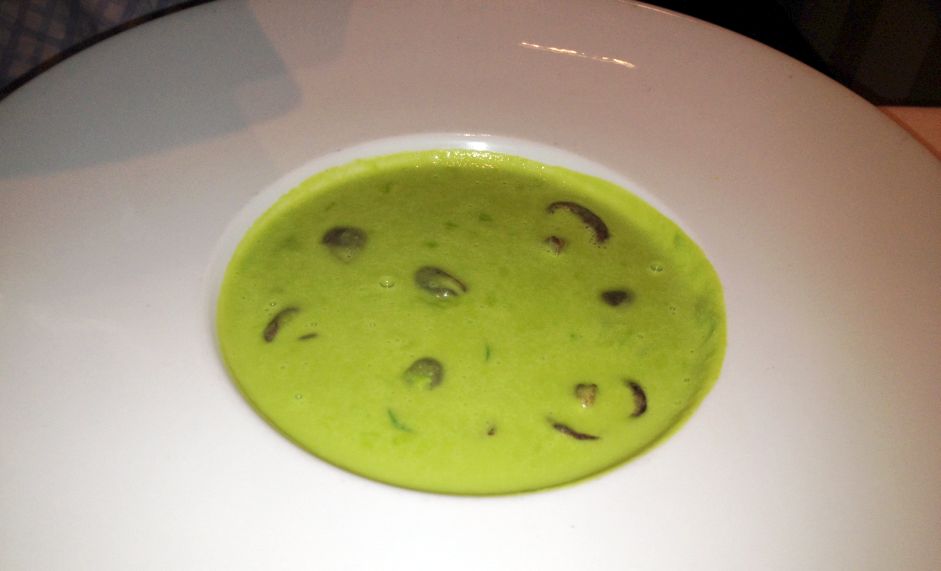 Raj decided with the Sugar snap pea soup was brought out with a appetizing bright shade of green. The soup was sweet and creamy with roasted chuck of shiitake mushrooms in it as savory counterpoint and a few whole peas for added texture.