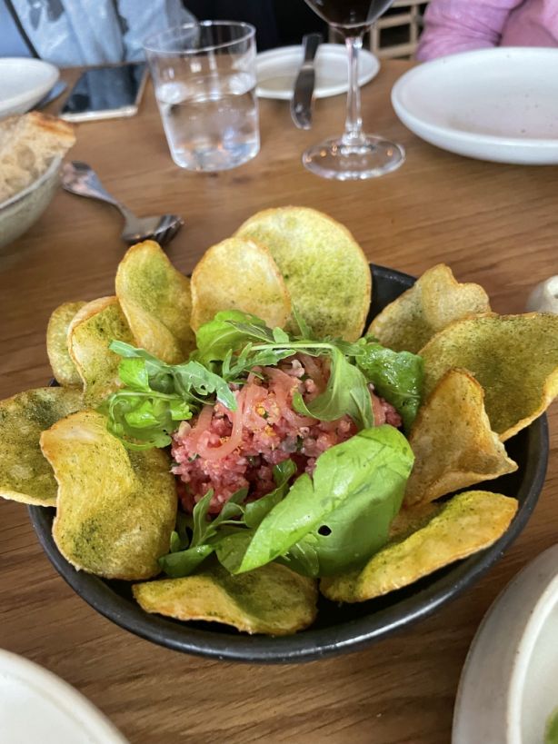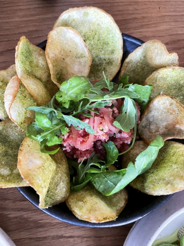 STEAK TARTARE, brioche toast, cured egg yolk, black garlic.
