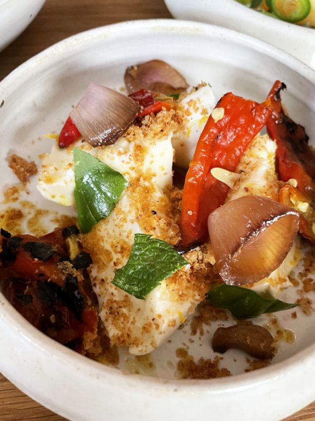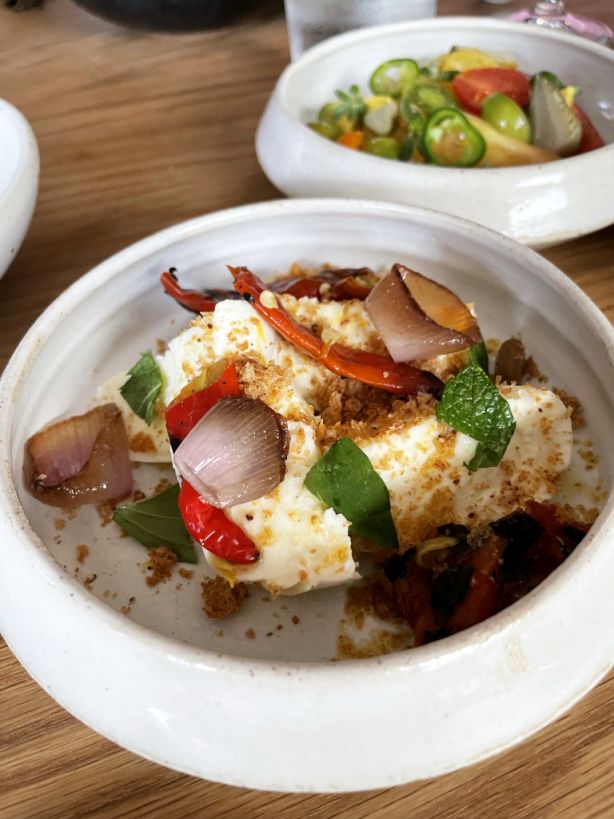Two rock MOZZARELLA, jimmy nardello, cipollini onion, pangrattato