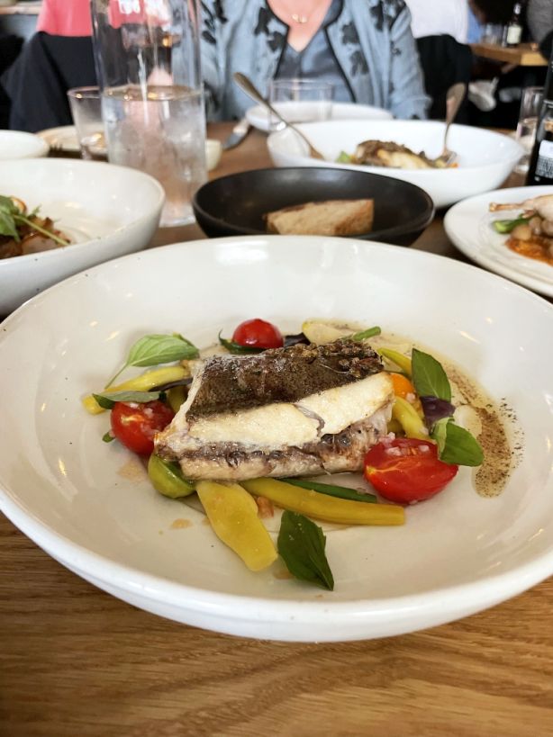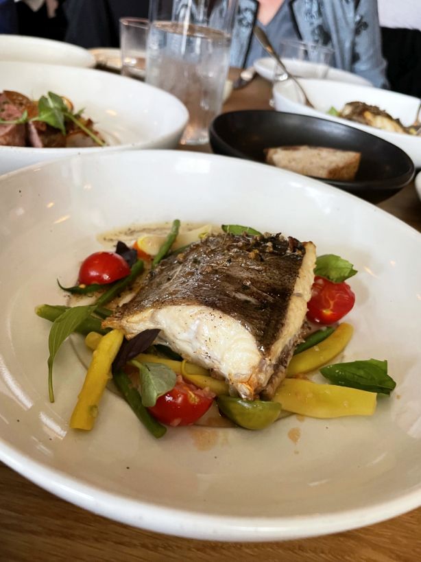 Roasted Halibut with summer tomatoes, green and yellow beans, basil.