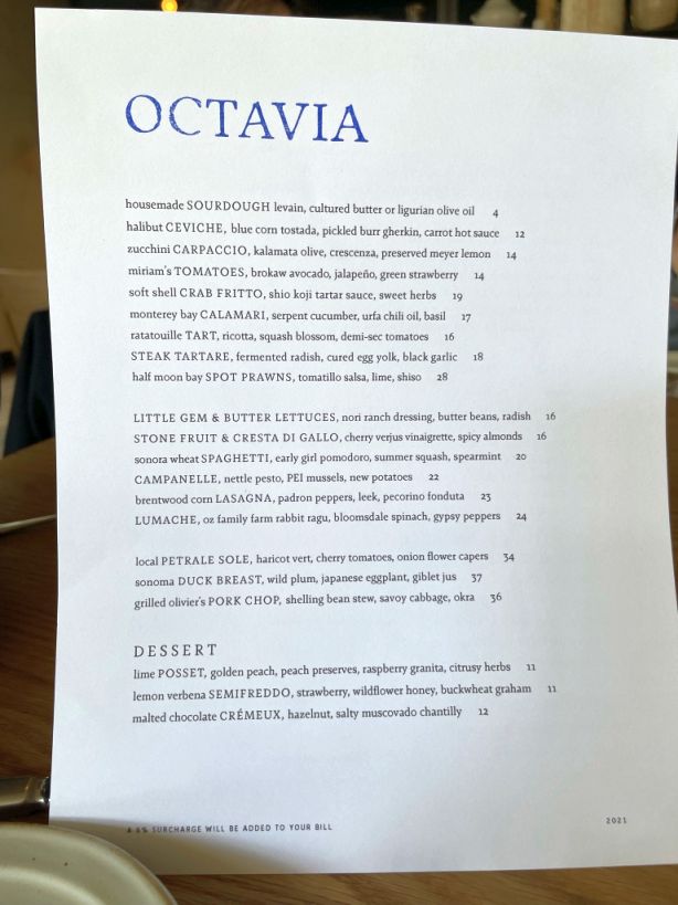 Octavia is probably one of our favorite 1 Michelin Star restaurant in San Francisco. The food is always great and we also like the ambiance and the service.