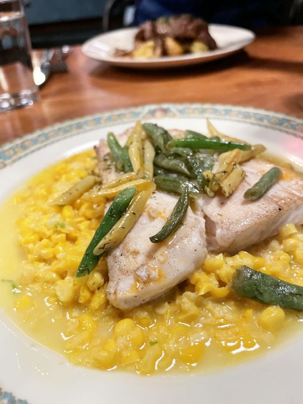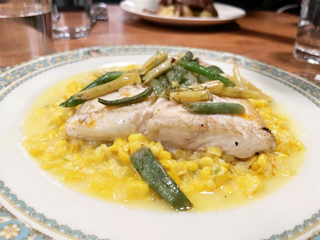 For my main dish I selected the Roasted halibut, buttered corn and summer beans, chili oil and dill.