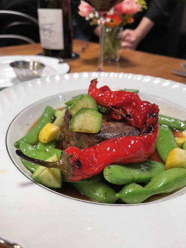 Kevin ordered the crispy lamb shoulder, summer squash, snap peas, marinated Nardello peppers with fresh herbs.