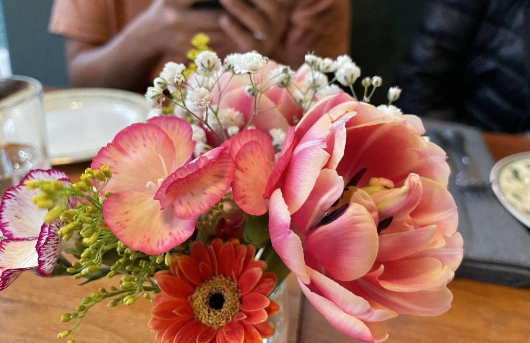 The table set up is simple with a nice bouquet of flowers in the center.,