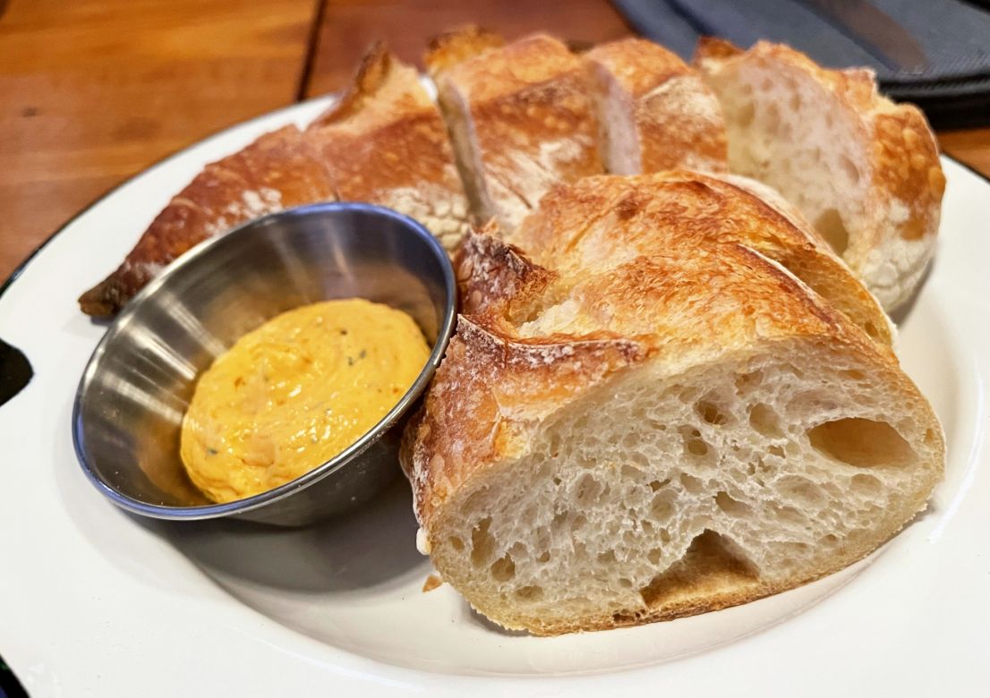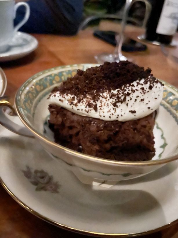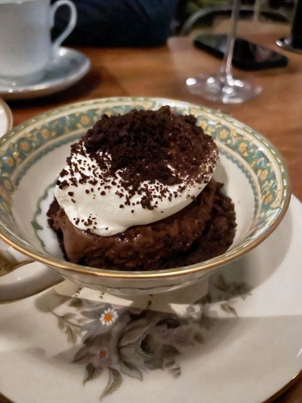 Inside, the restaurant has two levels, with a tall dining room sweeping up to a mezzanine overlooking the bar. Originally a jazz club, it’s morphed into many bars over the years, most recently Wild Hare, a dark tavern in black and red.