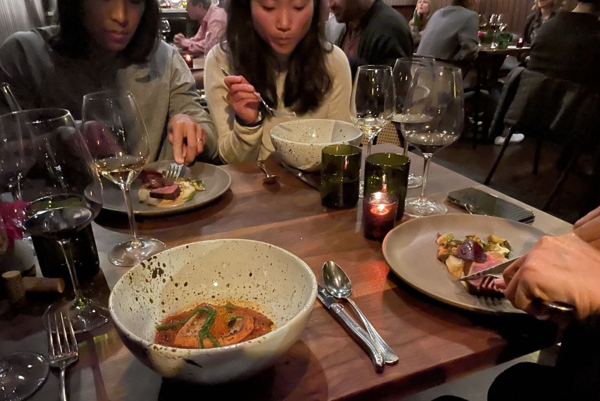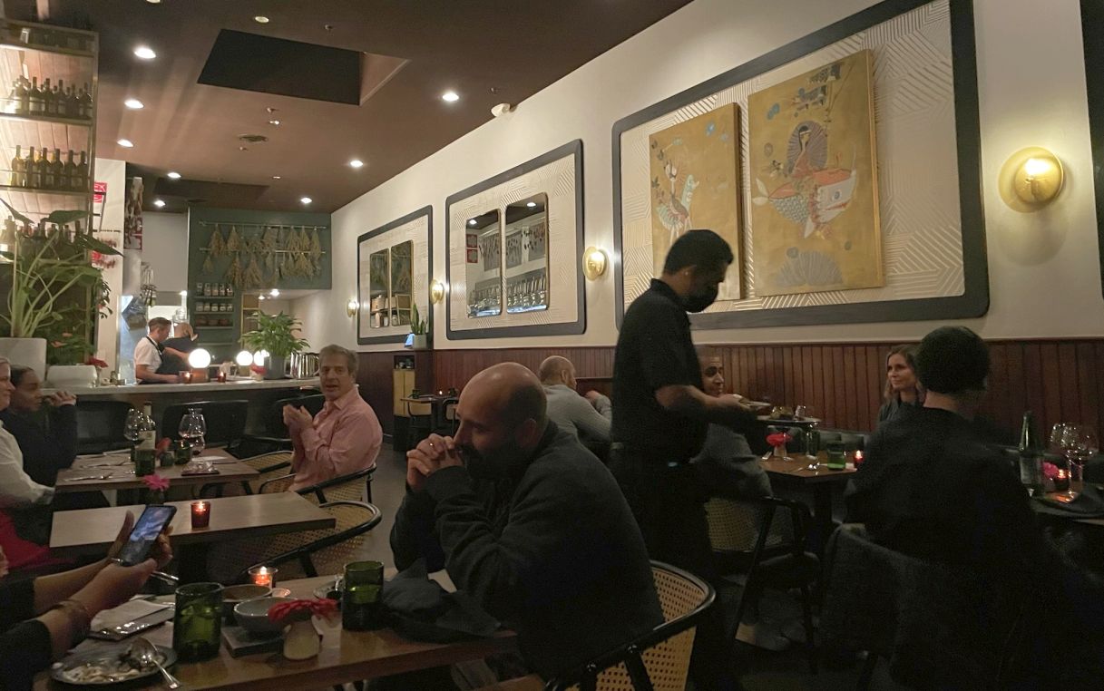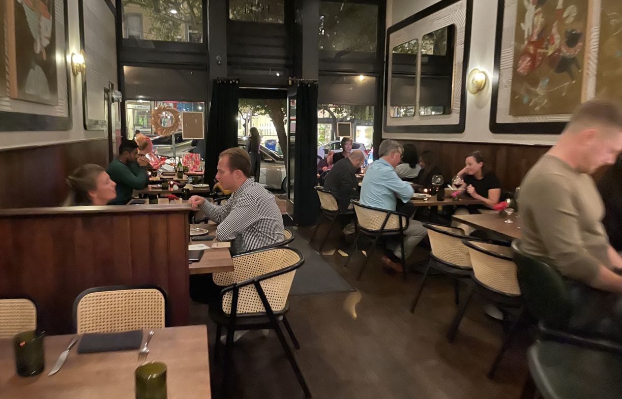 a neighborhood restaurant: cozy, dimly-lit with dark wood interior and full of