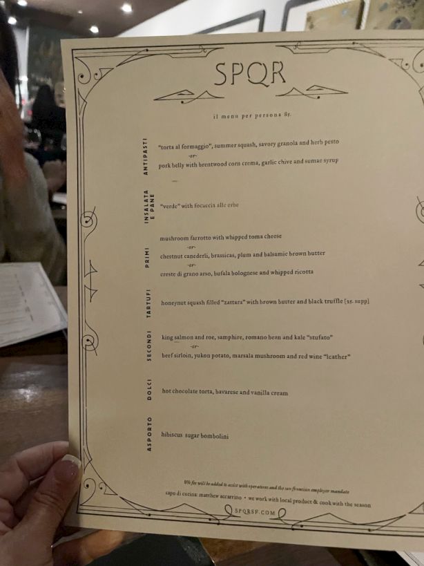 SPQR is an Italian osteria known its fresh pasta and located in Pacific Heights, that serves wine and more casual food than their popular sister restaurant A16 in the Marina district. SPQR is an acronym for Senatus Populusque Romanus and translate to "The People and Senate of Rome". Two thousand years ago it was the emblem for the Roman Empire and now, in 21st century San Francisco, SPQR is the very highest emblem of what's possible in contemporary Italian cuisines.