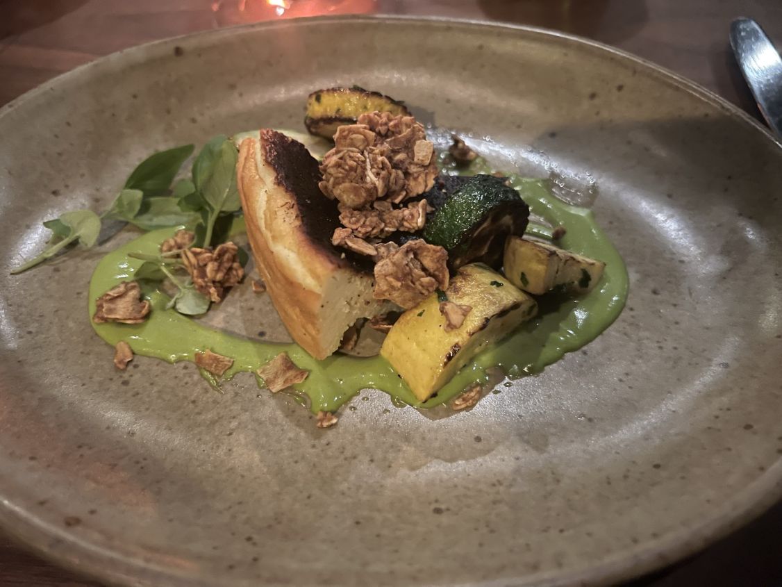 What a gorgeous plate! the cheese tart was rich and creamy, I just loved the grilled vegetables with a flavorful herb pesto sauce, and I also appreciate the crunch of the granola.