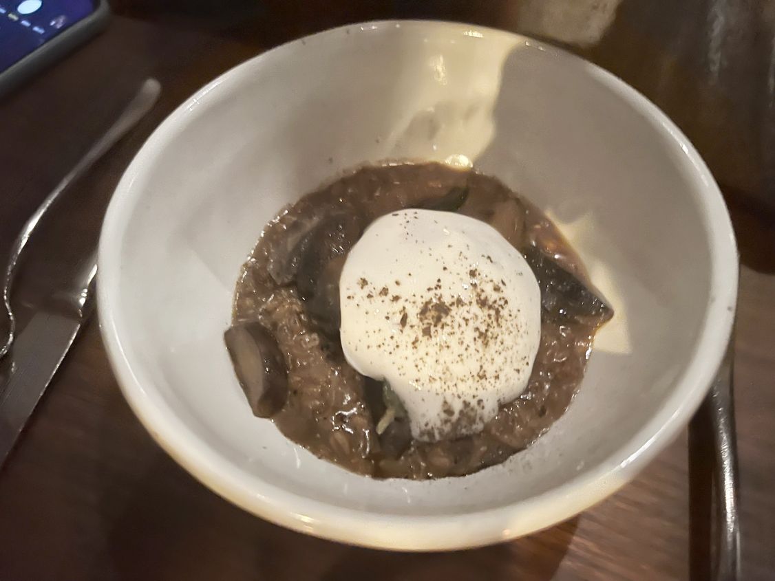 MUSHROOM FARROTA WITH WHIPPED TOMA CHEESE.