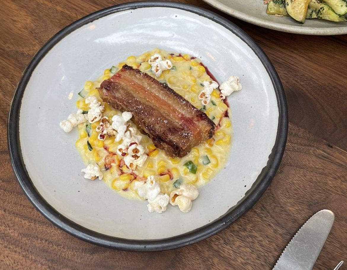 PORK BELLY WITH BRENTWOOD CORN CREMA, GARLIC CHIVE AND SUMAC SYRUP