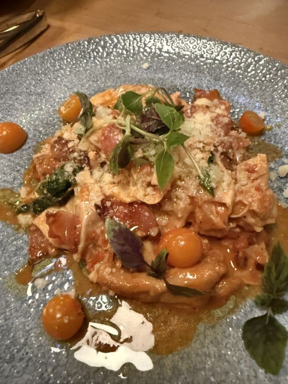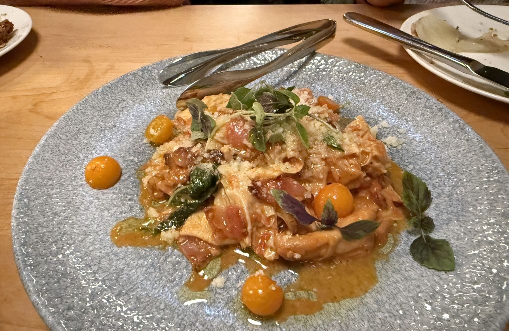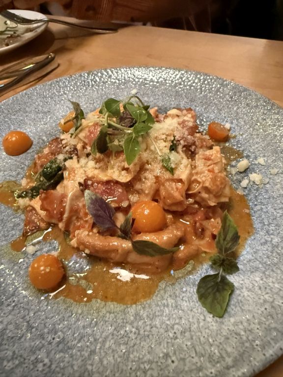 Yuba all'amatriciana, Jowl bacon & chanterelles & roasted tomatoes.