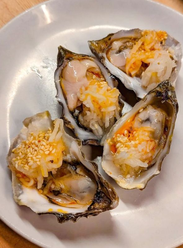 On the right is the famous Hog island oysters with Kohrabi kraut & sesame.