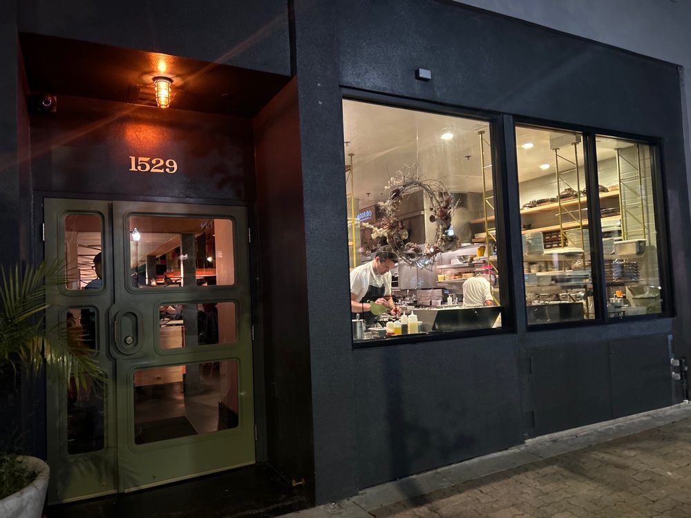 The front of the restaurant with a large window with a view of an open kitchen.