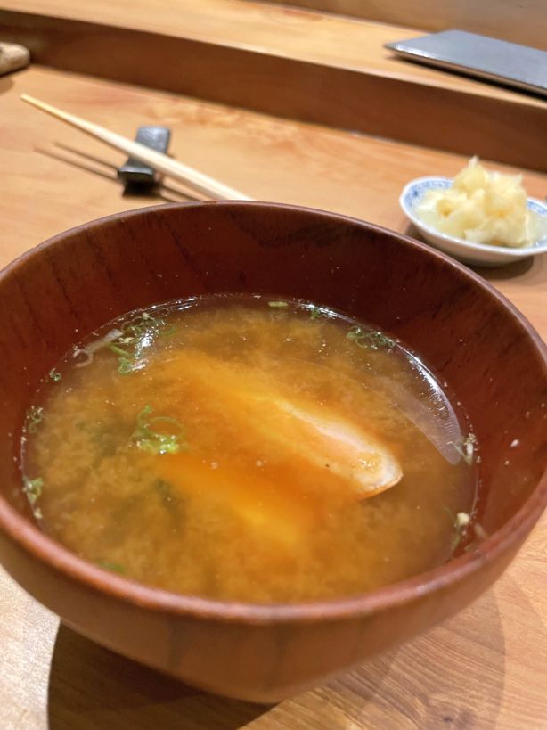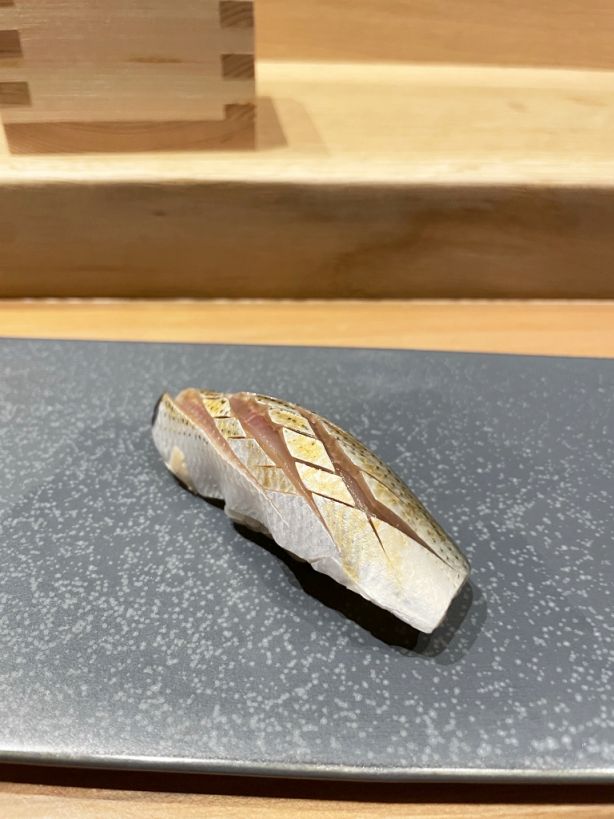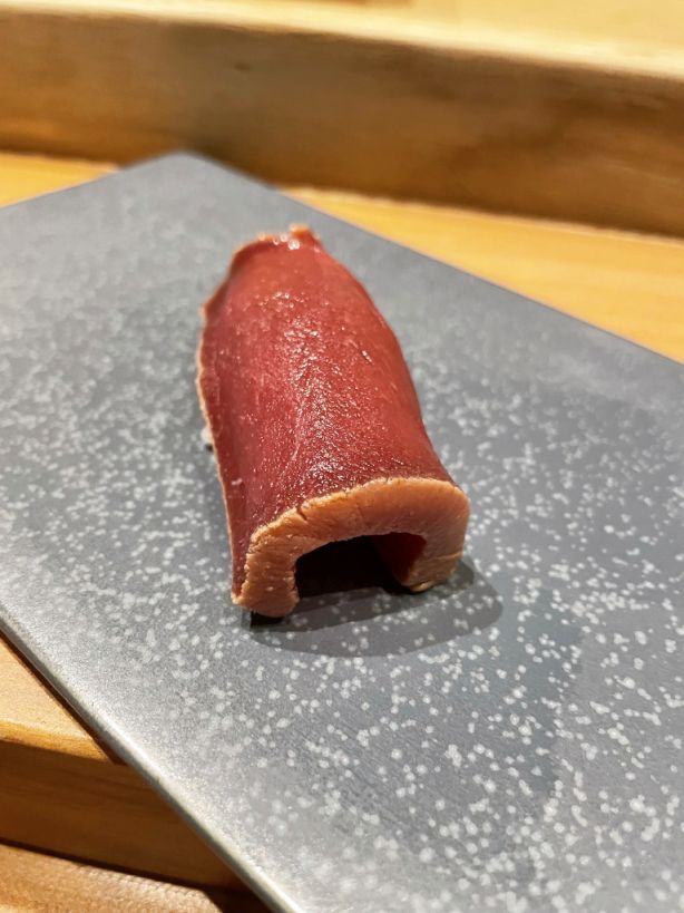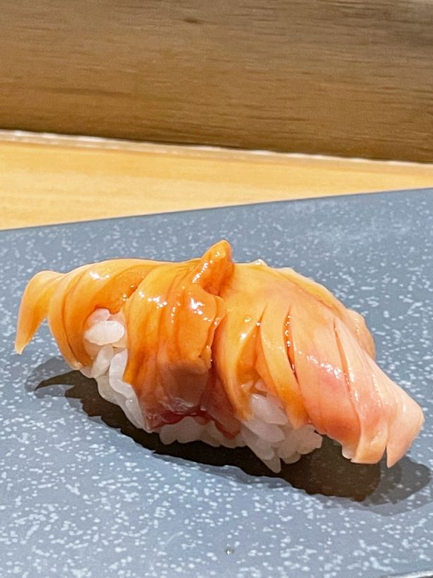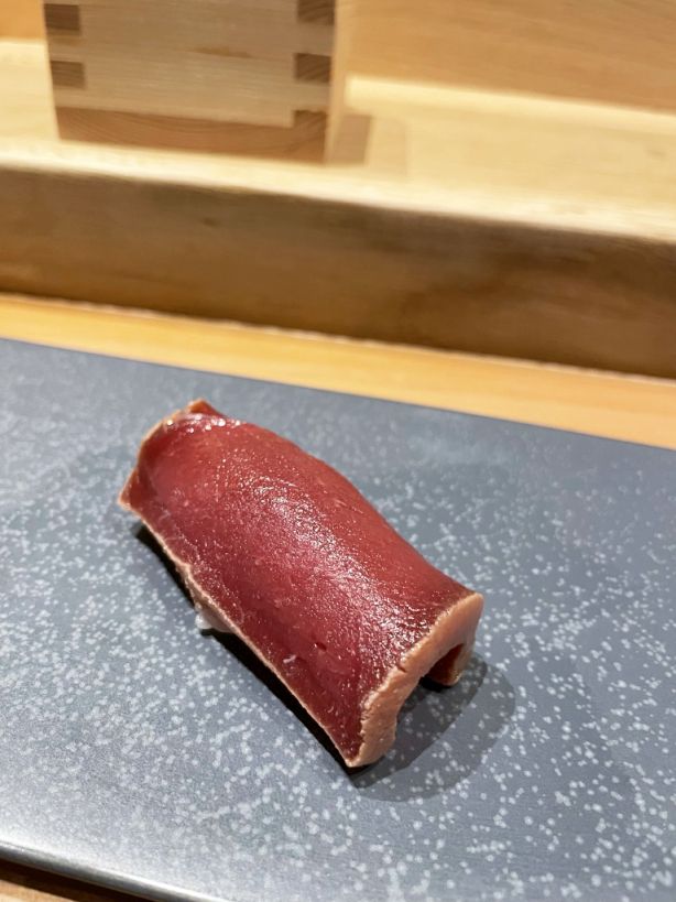 Ark Shell Clams (Akagai) is truly classic Edomae style, it used to be plentiful in Edo Bay but these days it has become scarce and pricey. The Ark Shell clams is washed in vinegar water and then carefully butterflied and sliced. Just before serving Jason slammed the Ark Shell clams on the cutting board to further tighten the flesh and the resulting bit is delicious, sweet, and has a little crunch.