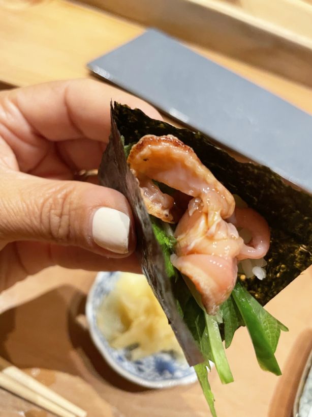 The whole bite is so interesting as the shisho has a mysterious bright taste that is reminiscent of mint, basil, tarragon, cilantro, anise, all in one bite!
