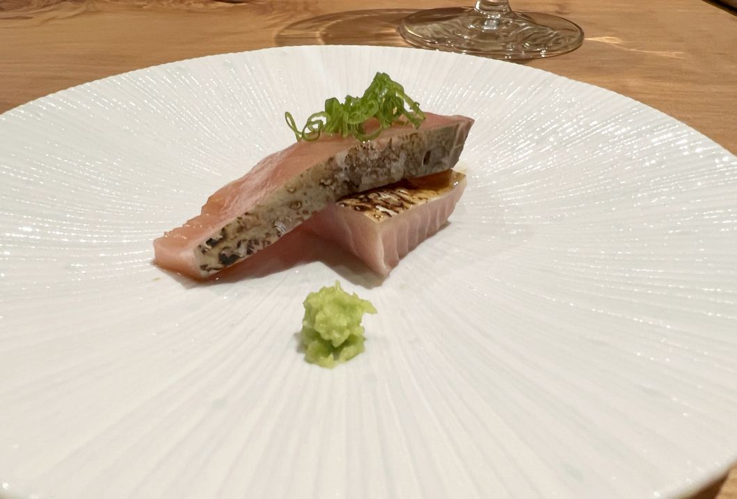 This is a "two" bite dish. The fist bite is the portion on top with grated ginger and scallion brushed in soy sauce and the second bite (underneath) is with freshly grated wasabi.