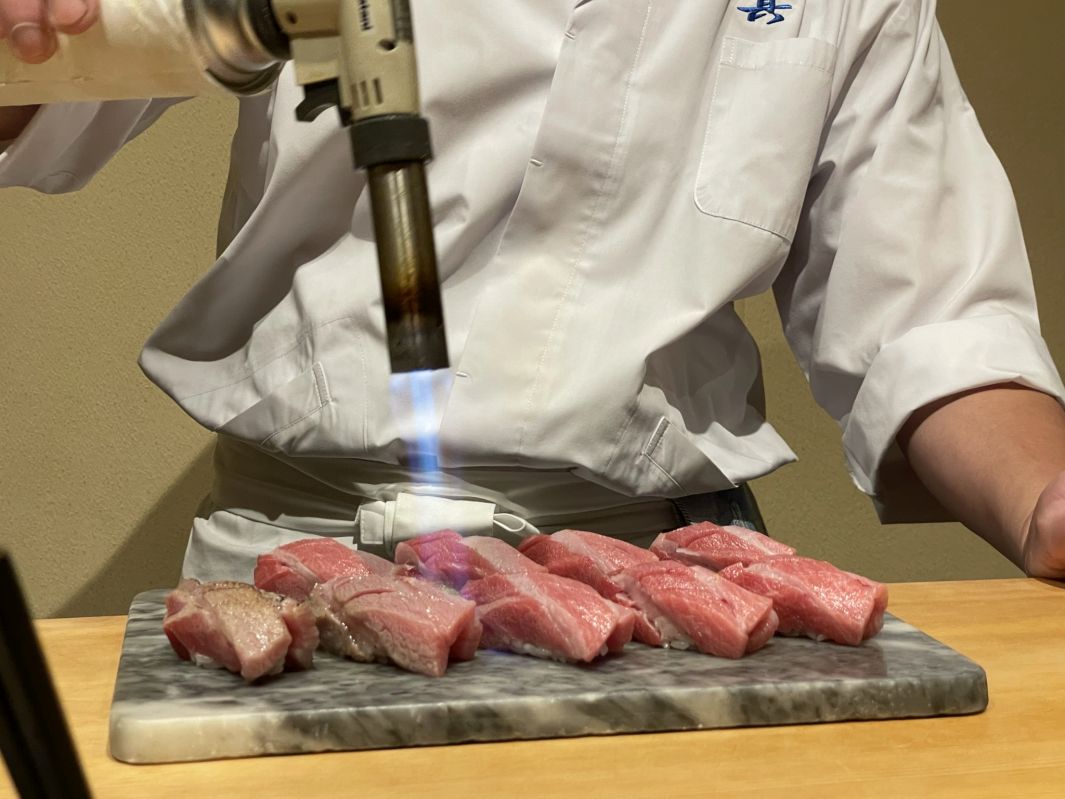 The art of making nigiri! The chef needs to balance the right amount of rice and portion the fish to create the perfect one bite!
