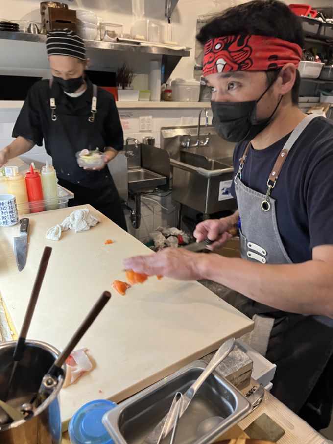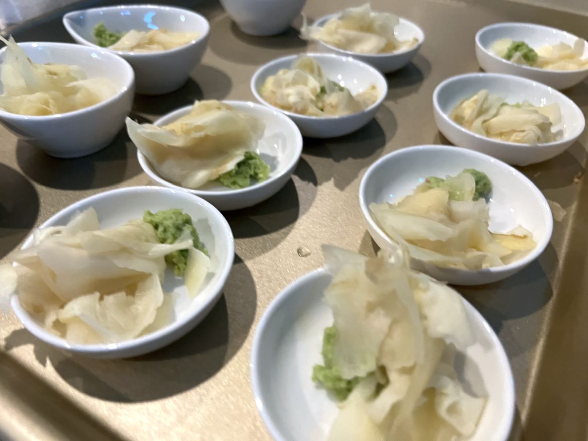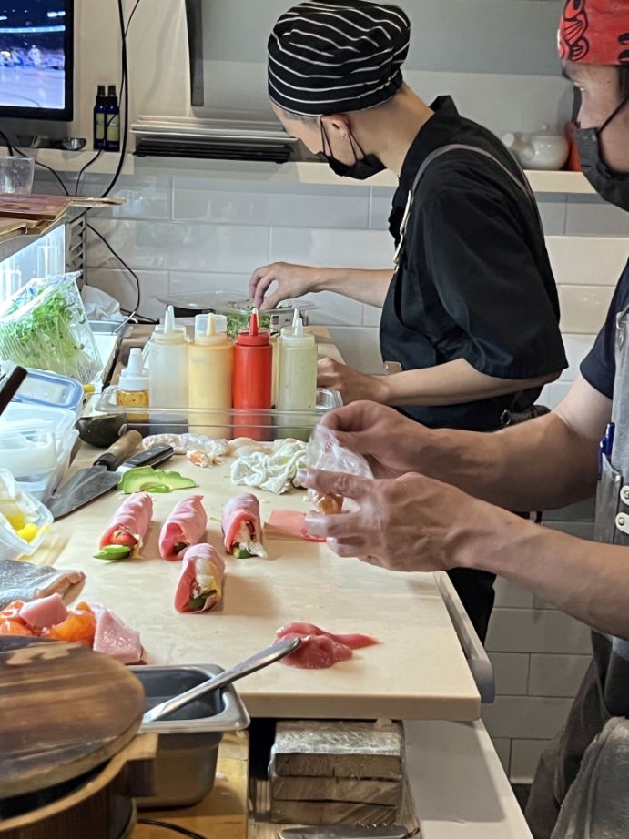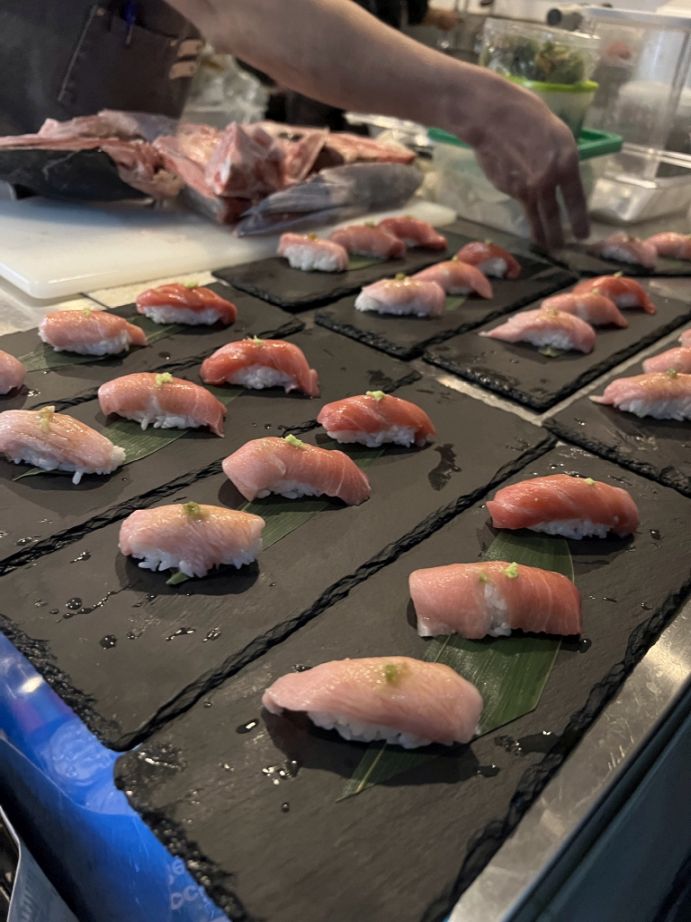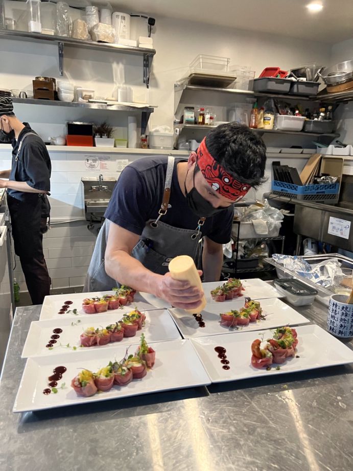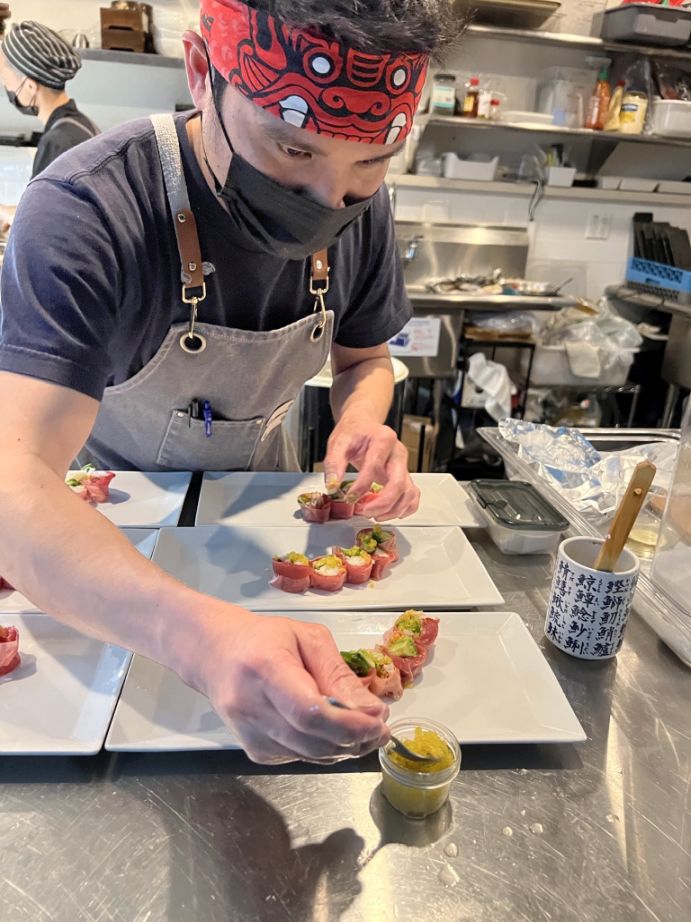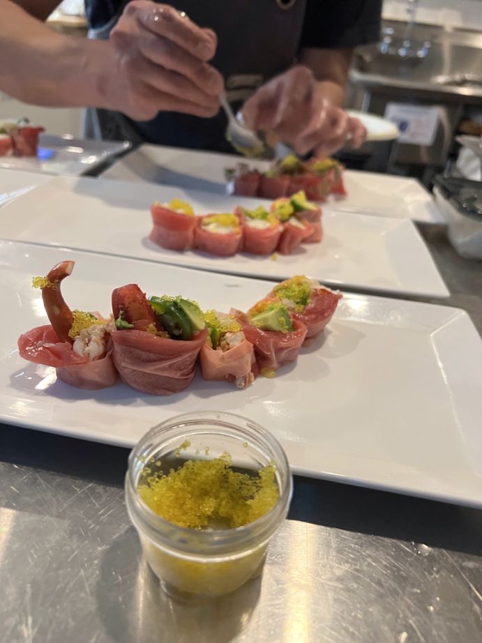 The roll are done and Chef Ti is starting to plate. Adding yuzu tobiko on top of the roll.