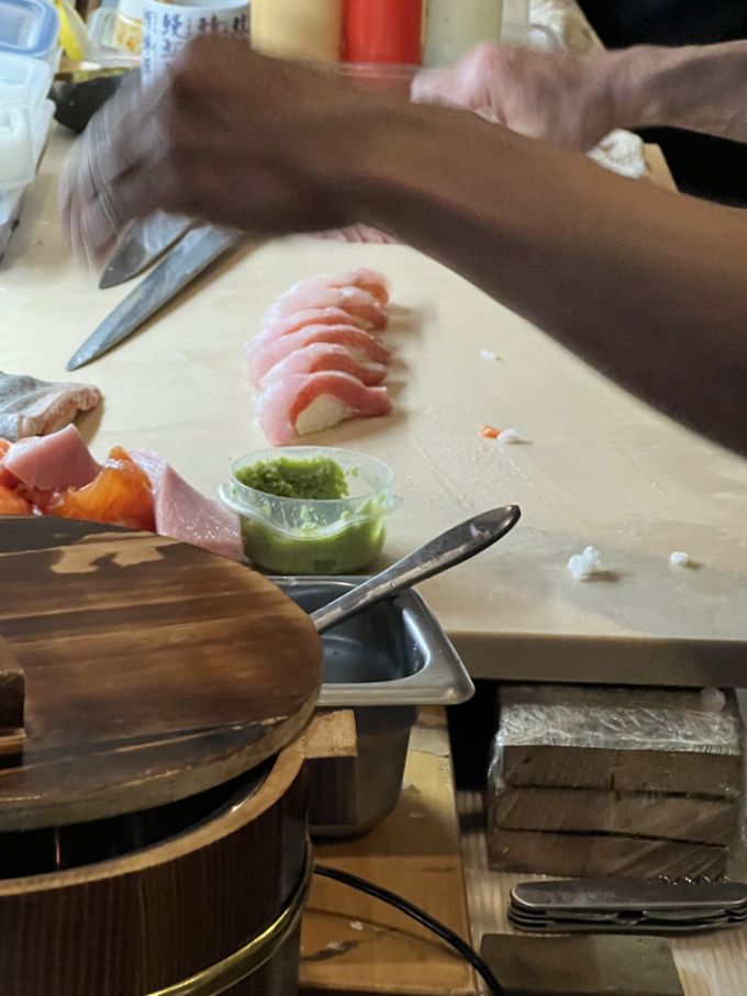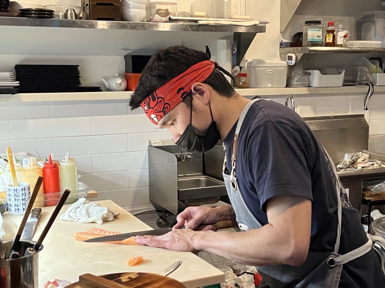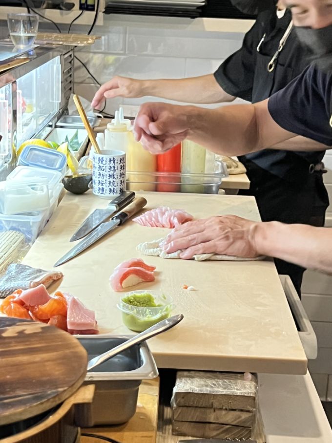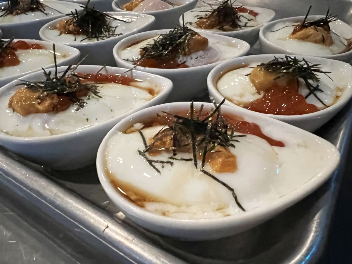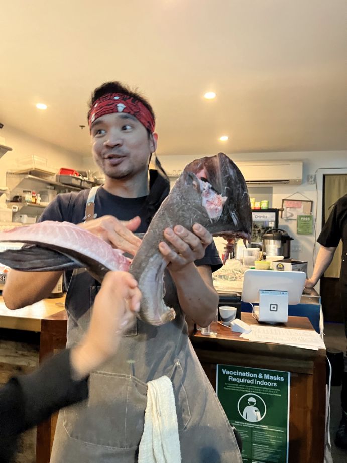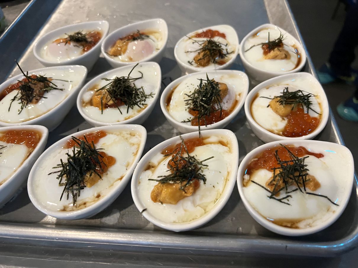 The roll are done and Chef Ti is starting to plate. Adding yuzu tobiko on top of the roll.