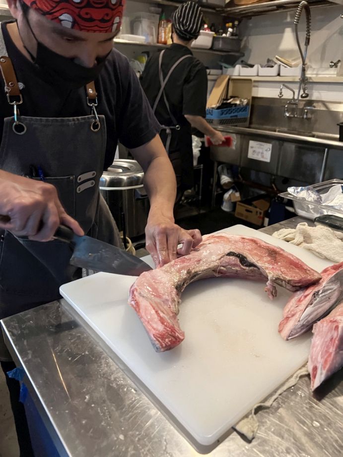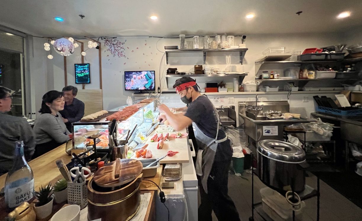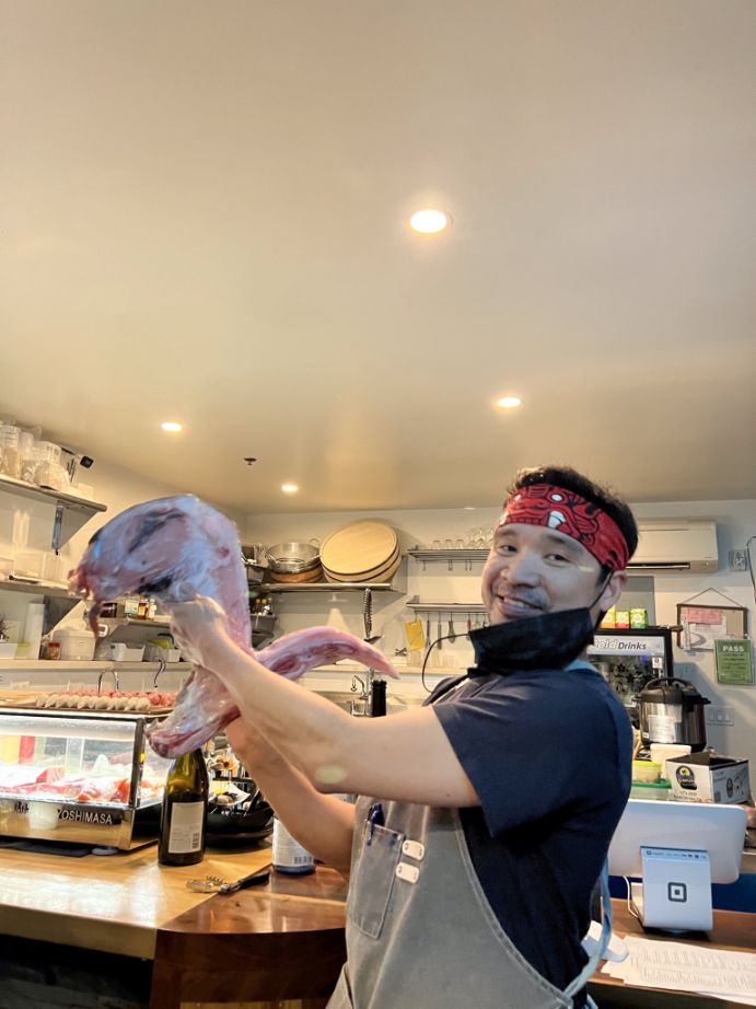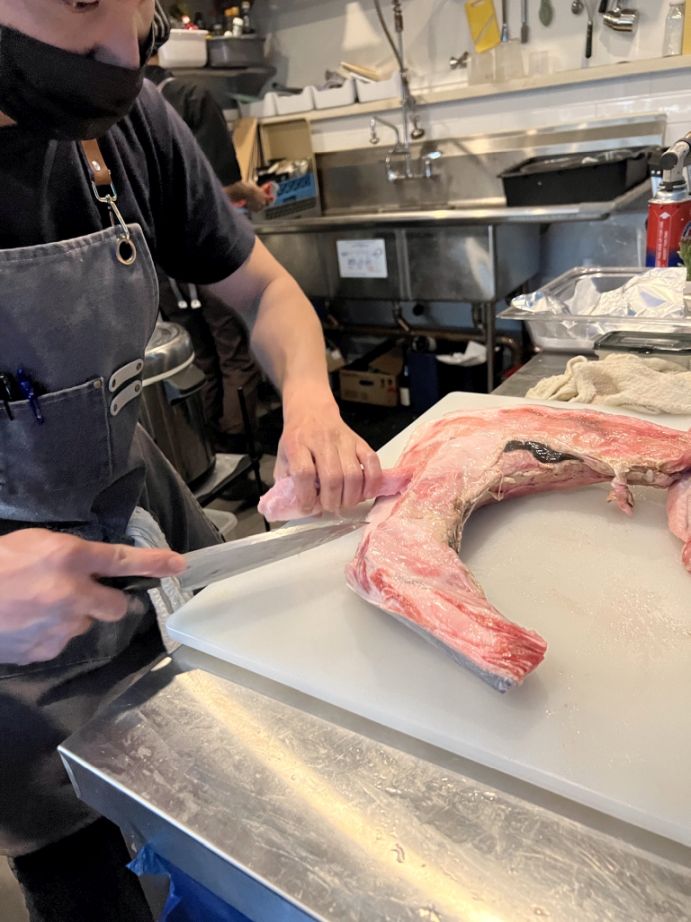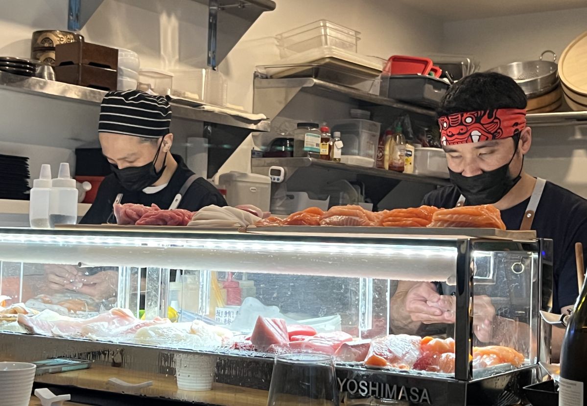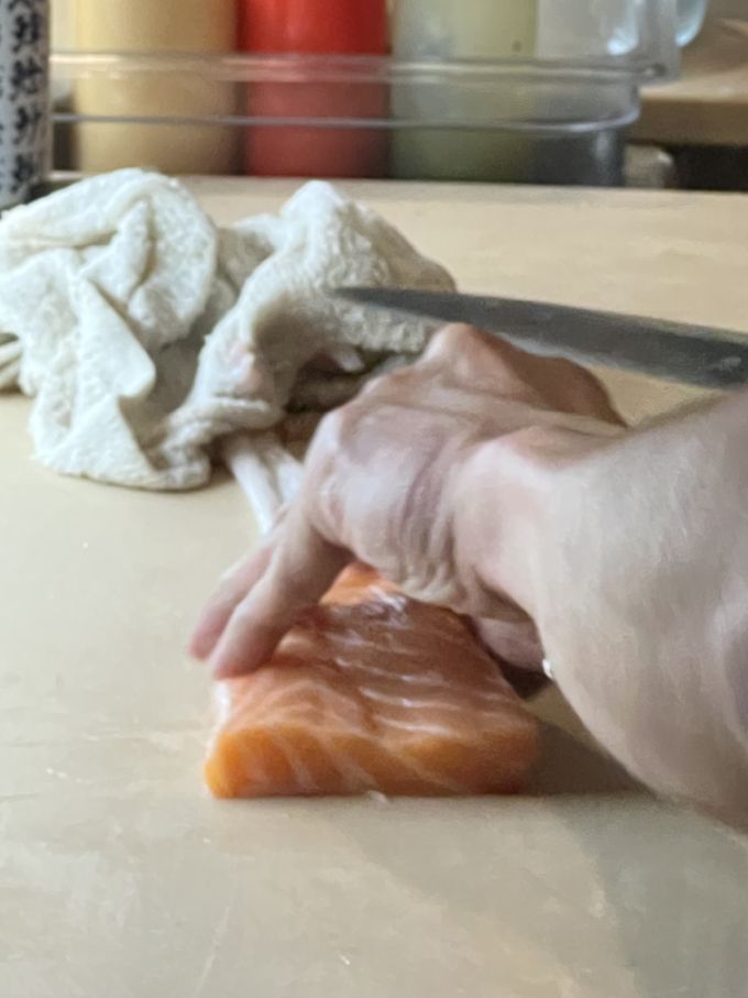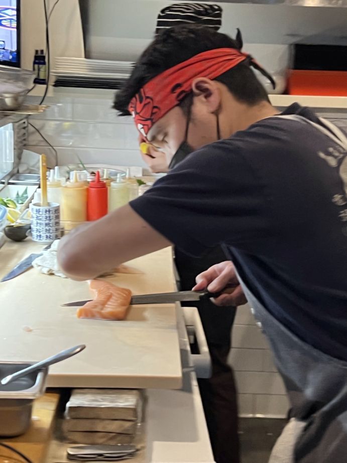 The roll are done and Chef Ti is starting to plate. Adding yuzu tobiko on top of the roll.