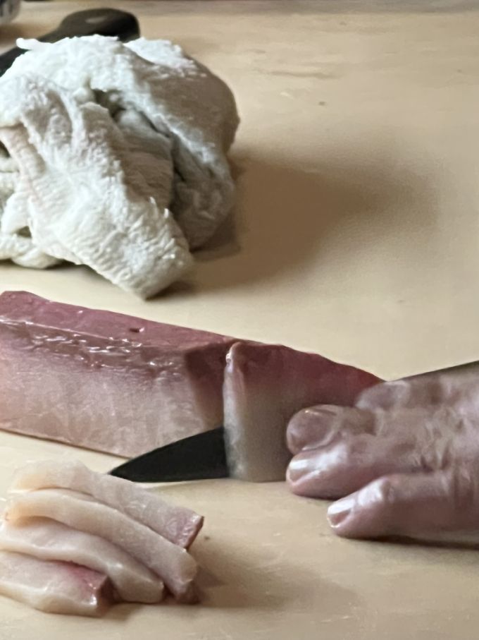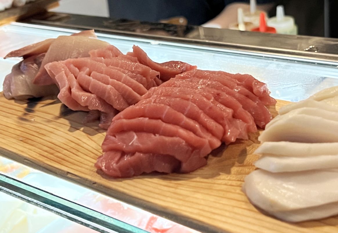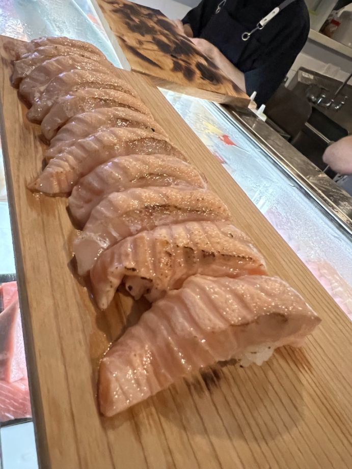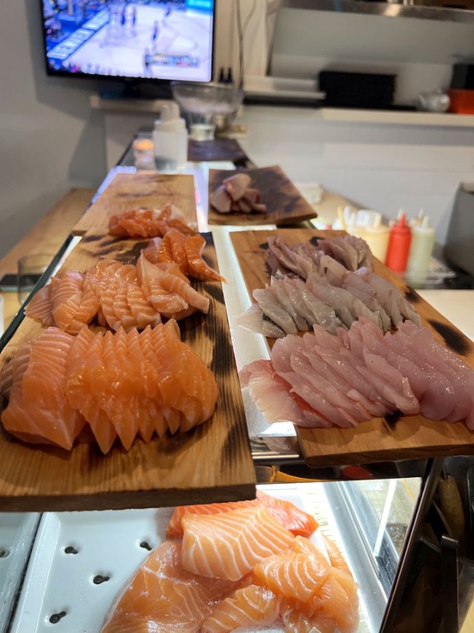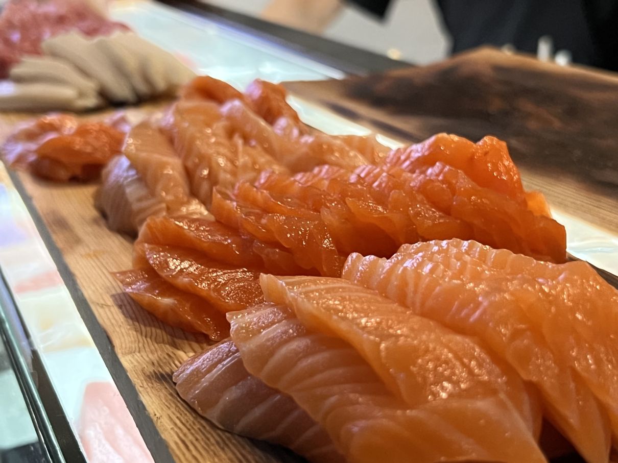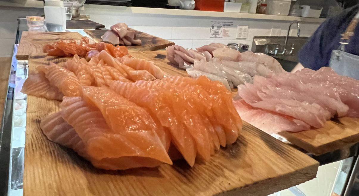 Tons of fish are sliced and carefully laying on wooden blocks.
