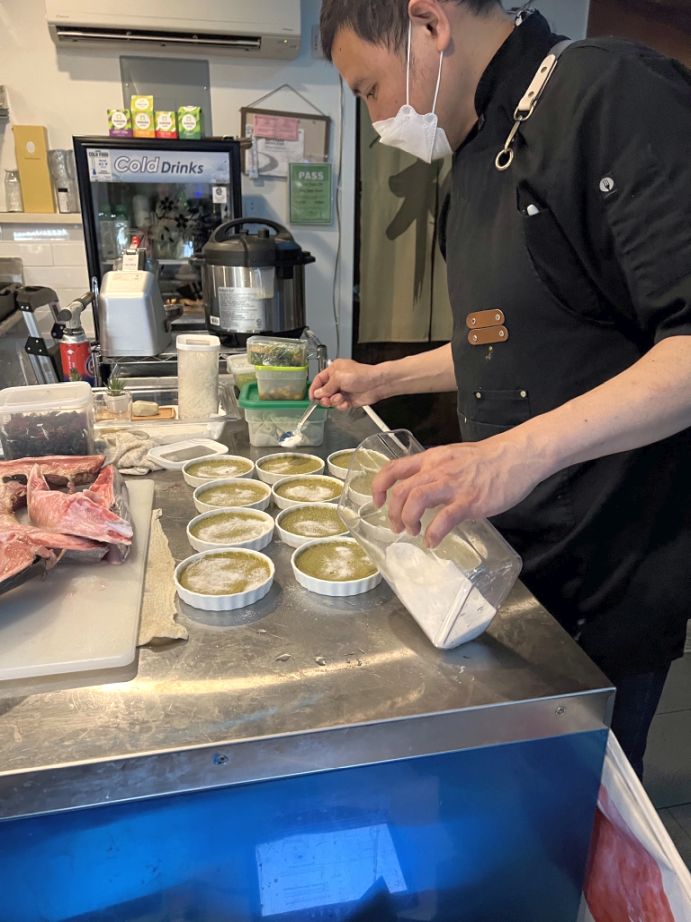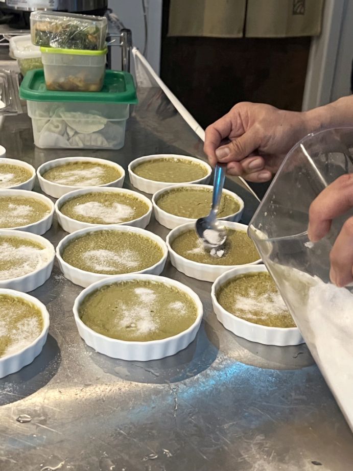 Kiwi preparing the Matcha crème brulee but putting a few spoons of sugar and then he will torched it for a crunchy top.
