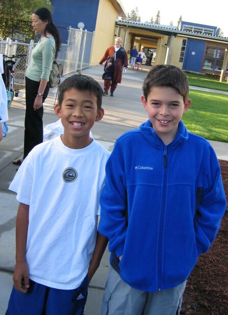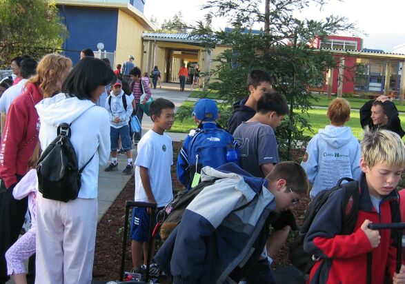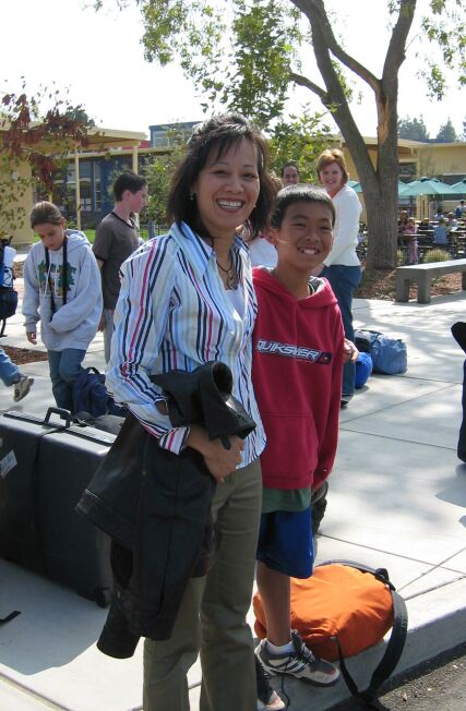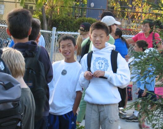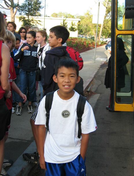 Waiting with Andrew Chen. The bus should arrive in 5 minutes or so.... All of the kids are really excited about this trip. 5 days in the wild without their parents. |