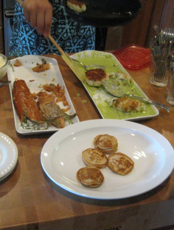 Home made Blini, smoked salmon, crab cakes with asparegus vinaigrette sauce.