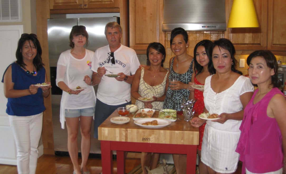 Huyen, Florianne, Thierry, Mai, Me, Hong, Hanh N. and Hanh P. standing around the appetizers table.