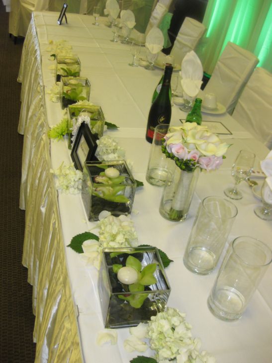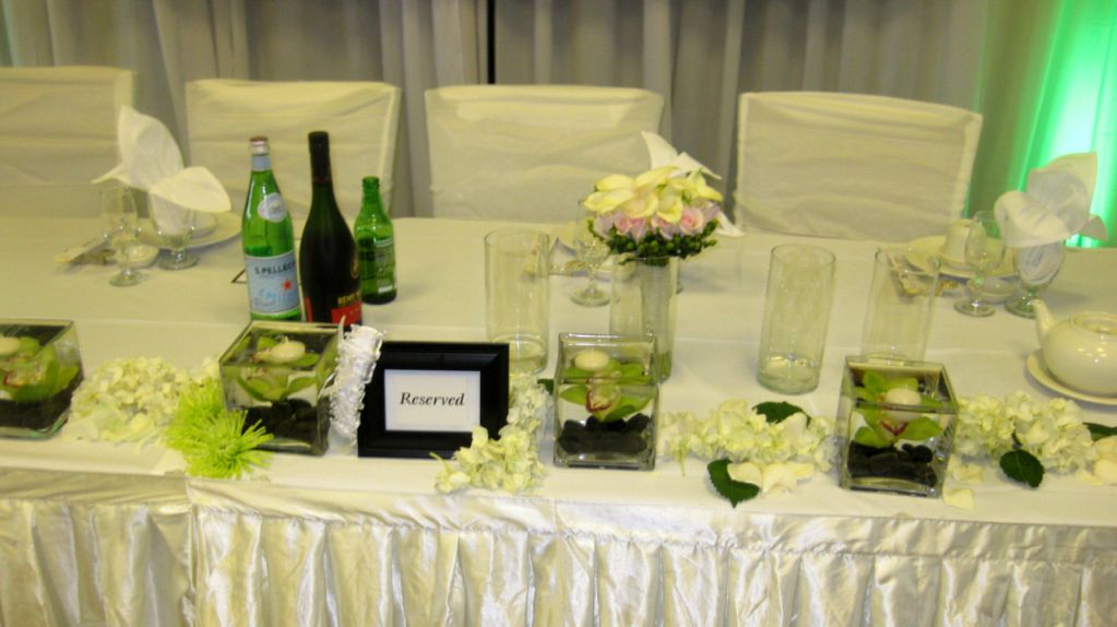 The Bride's and Groom's table decorated with gorgeous flowers arrangement.