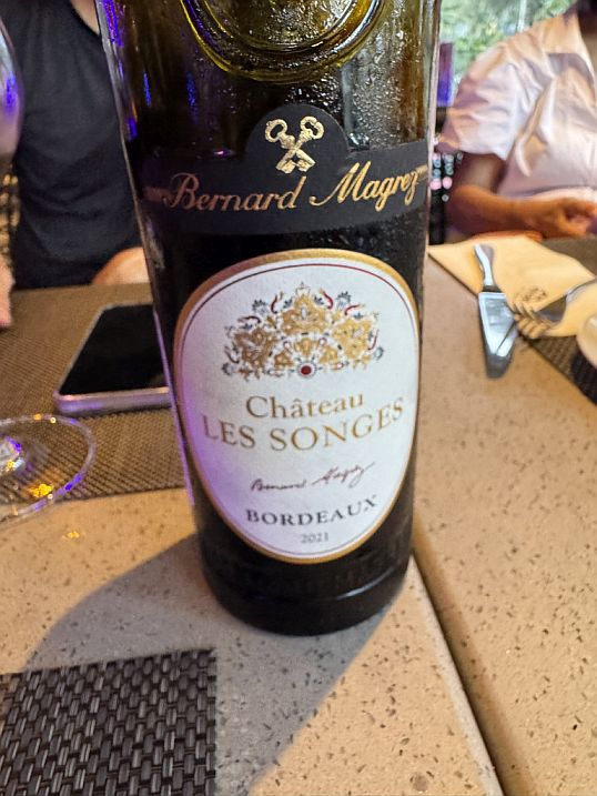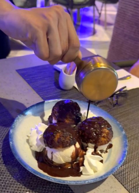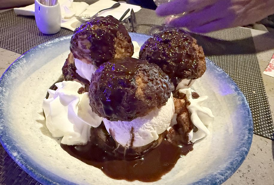 Dessert was a highlight: a plate of profiteroles filled with ice cream and whipped cream, and then our waiter pours the hot chocolate sauce over the top.